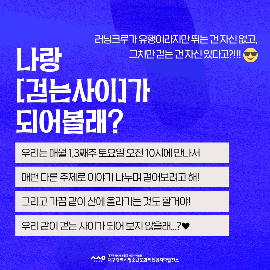 걷기 동아리 [걷는사이] 동아리원 모집작성자 : 최수빈 작성일 : 25-01-21