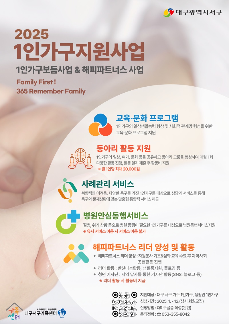 * 카카오오픈채팅 "대구서구가족센터 1인가구지원사업팀" 검색 후 1:1상담&문의