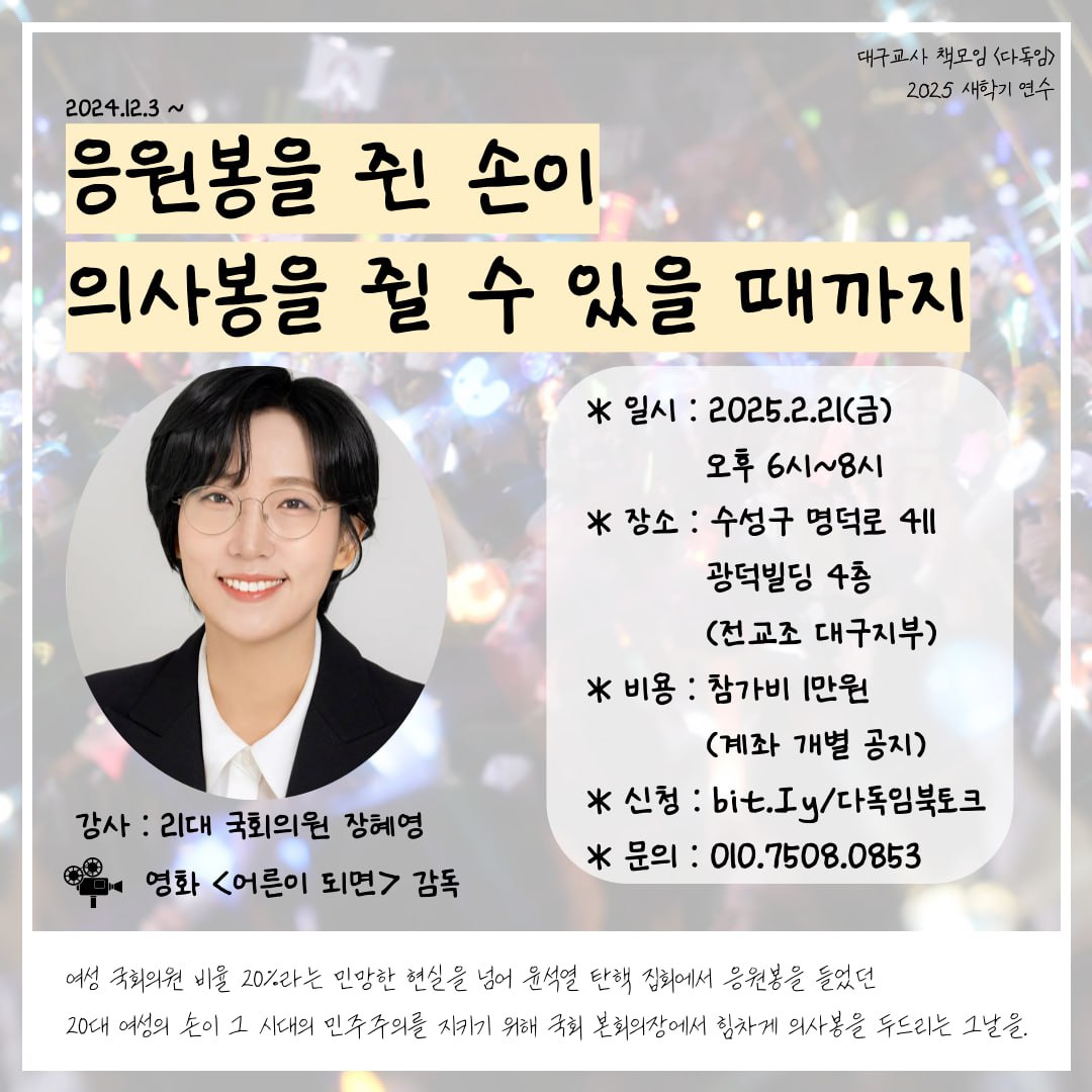 2025 새학기를 맞아 <다독임>에서 연수를 준비했습니다. 2024.12.3 비상계엄 이후 많은 시민들이 광장을 가득채웠습니다. 민주주의 교육의 장이었습니다. 응원봉으로 가득했던 광장에 대해 함께 이야기를 나눌 수 있는 장혜영 전 국회의원을 연수 강사로 모셨습니다. 많은 관심 부탁드립니다.