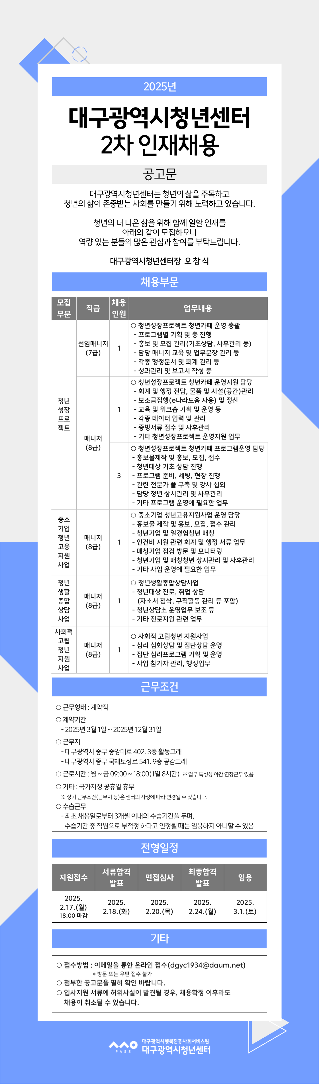 [제2025-02호] 대구광역시청년센터 인재채용 공고작성자 : 대구청년센터 작성일 : 25-02-07 대구광역시청년센터