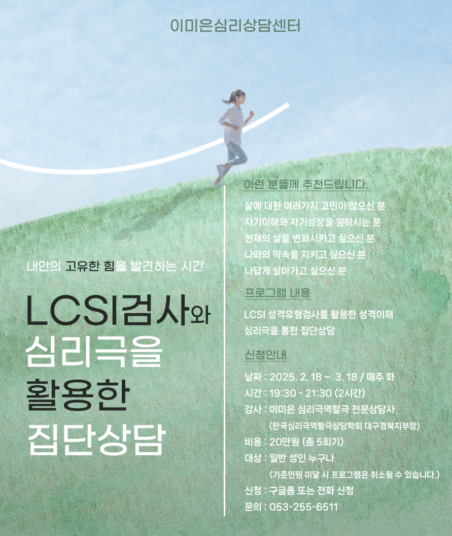 LCSI성격유형검사와 심리극과 함께하는 집단상담 모집작성자 : 최일선 작성일 : 25-02-12