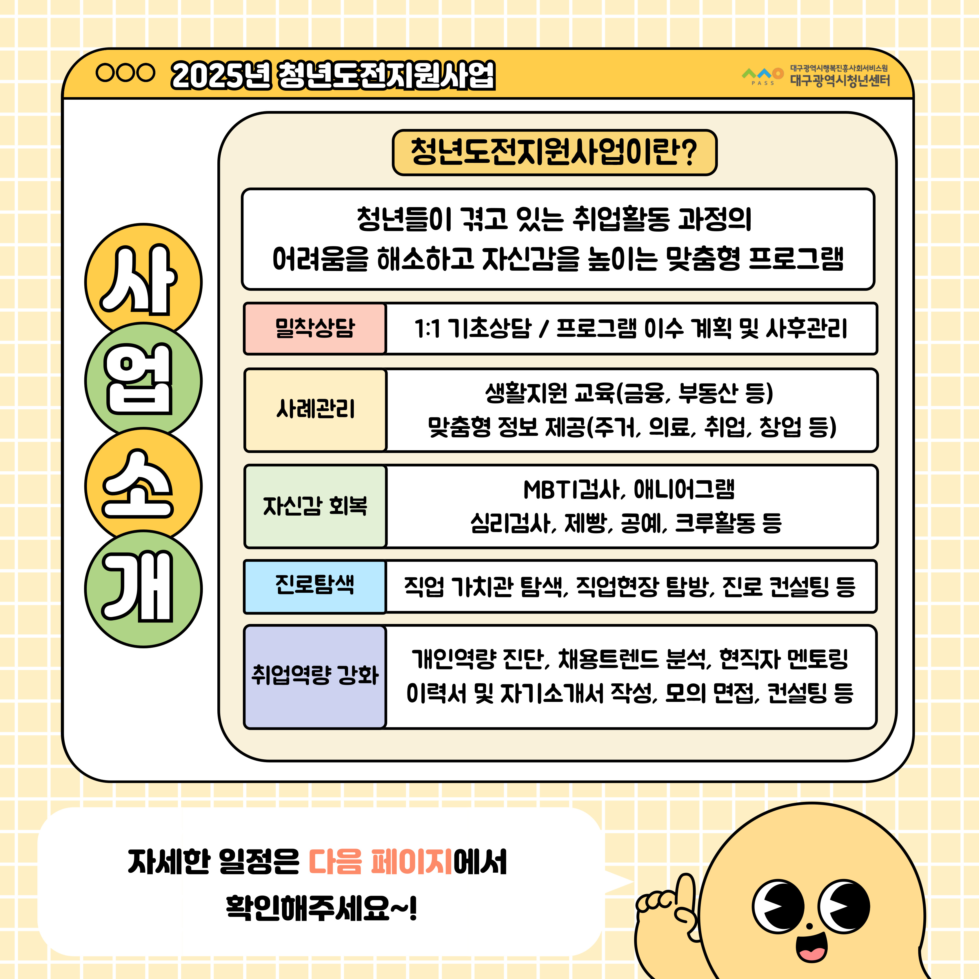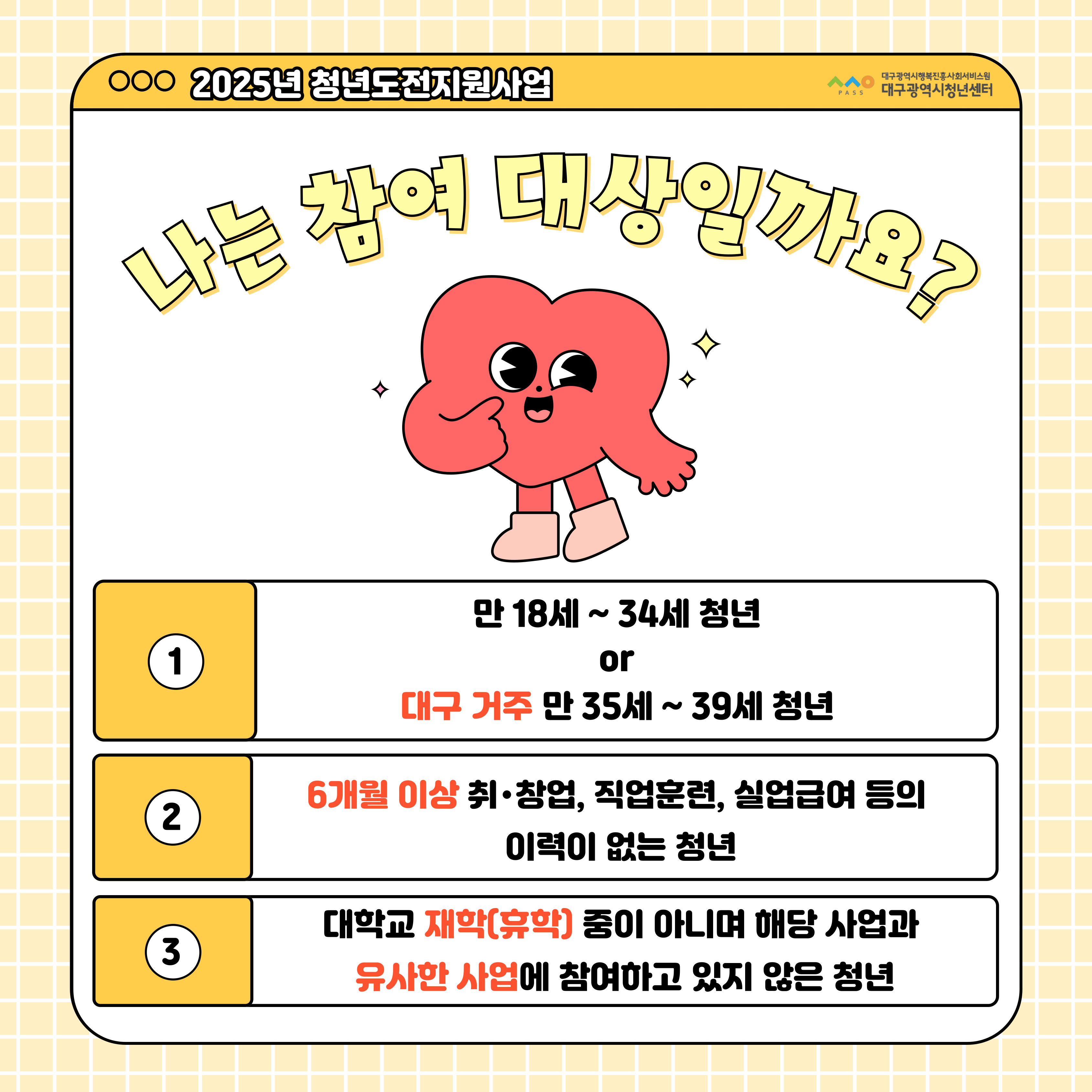 [ 공모/지원사업 ] 2025 청년도전지원사업 젊핑 사전안내작성자 : 대구청년센터 작성일 : 25-02-13 대구광역시청년센터