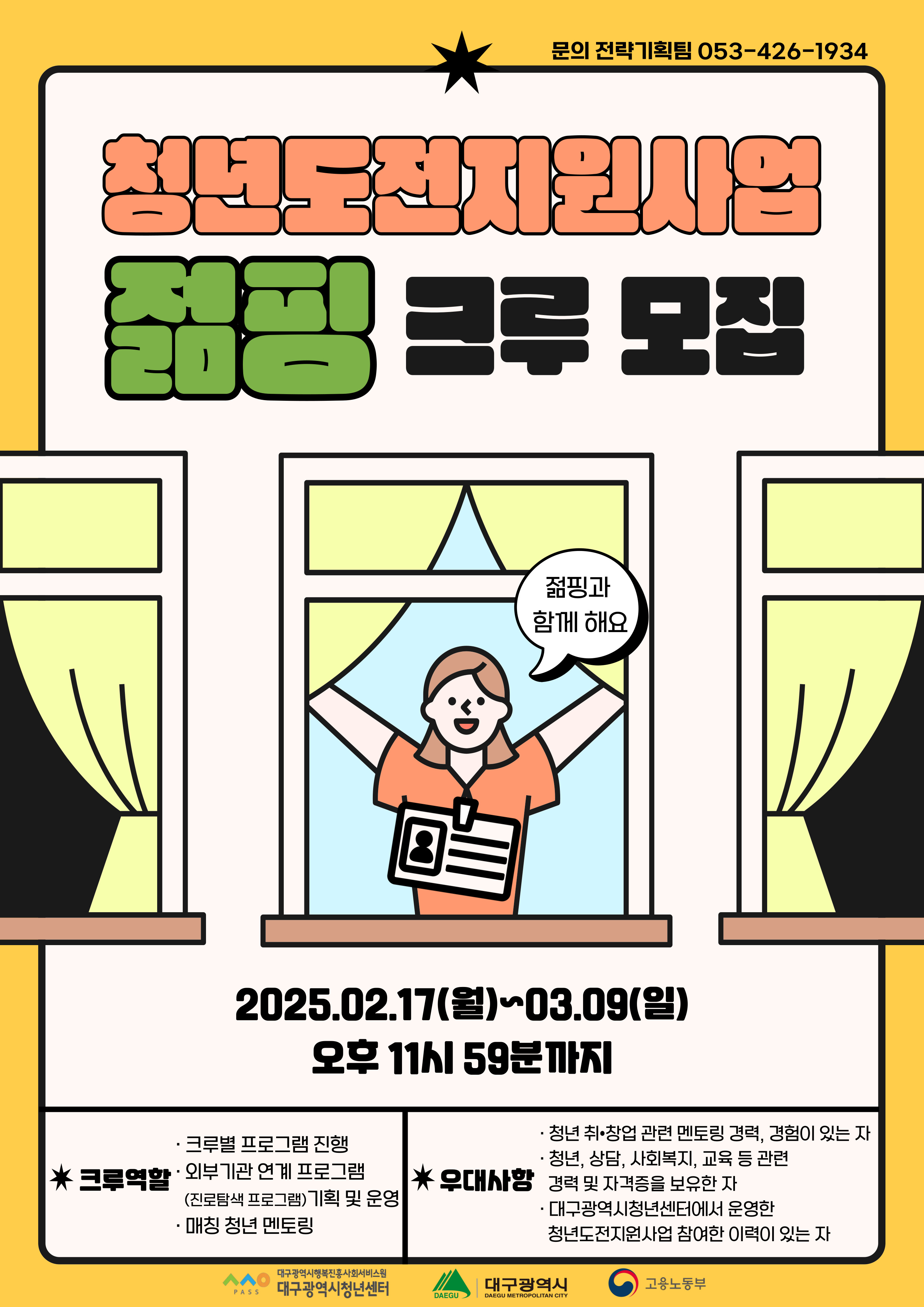 2025 청년도전지원사업 젊핑 크루 모집 공고작성자 : 대구청년센터 작성일 : 25-02-17 대구광역시청년센터