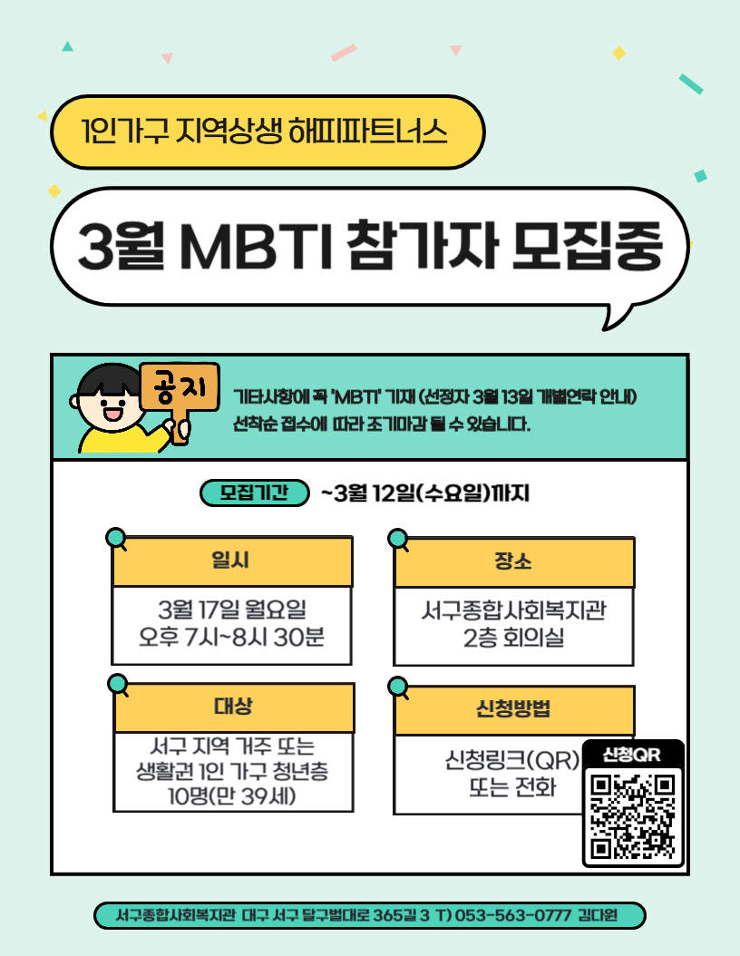 [서구종합사회복지관] 해피파트너스 3월 집단상담MBTI 참여자 모집작성자 : 김다원 작성일 : 25-02-18