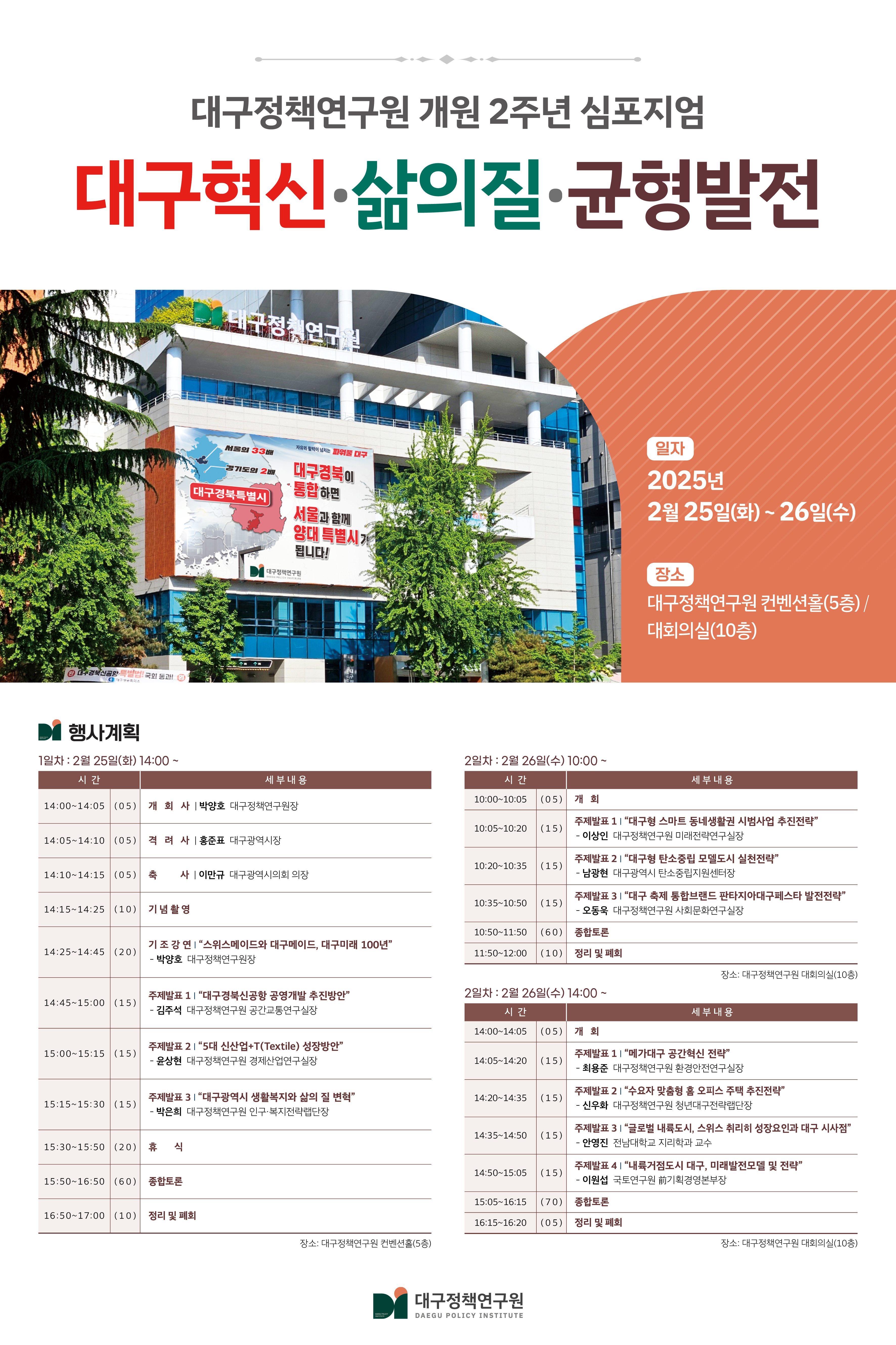 대구정책연구원 개원2주년 심포지엄 "대구혁신·삶의 질·균형발전"작성자 : 대구정책연구원 작성일 : 25-02-21