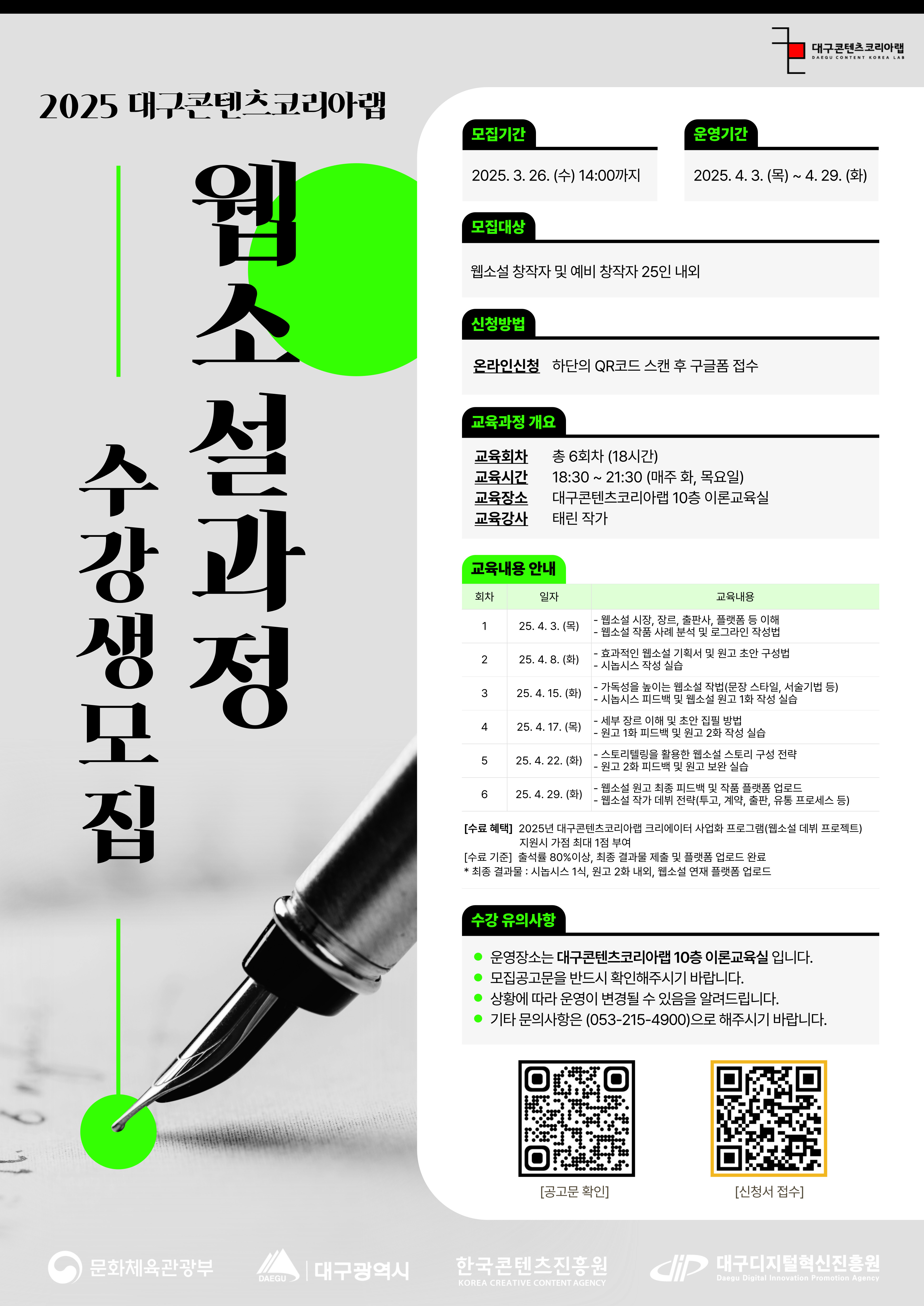 (재)대구디지털혁신진흥원에서는 2025년 대구콘텐츠코리아랩 운영사업의 일환으로 크리에이터 아카데미 웹소설 과정 참가자를 모집하고자 하오니, 많은 관심과 신청 바랍니다.