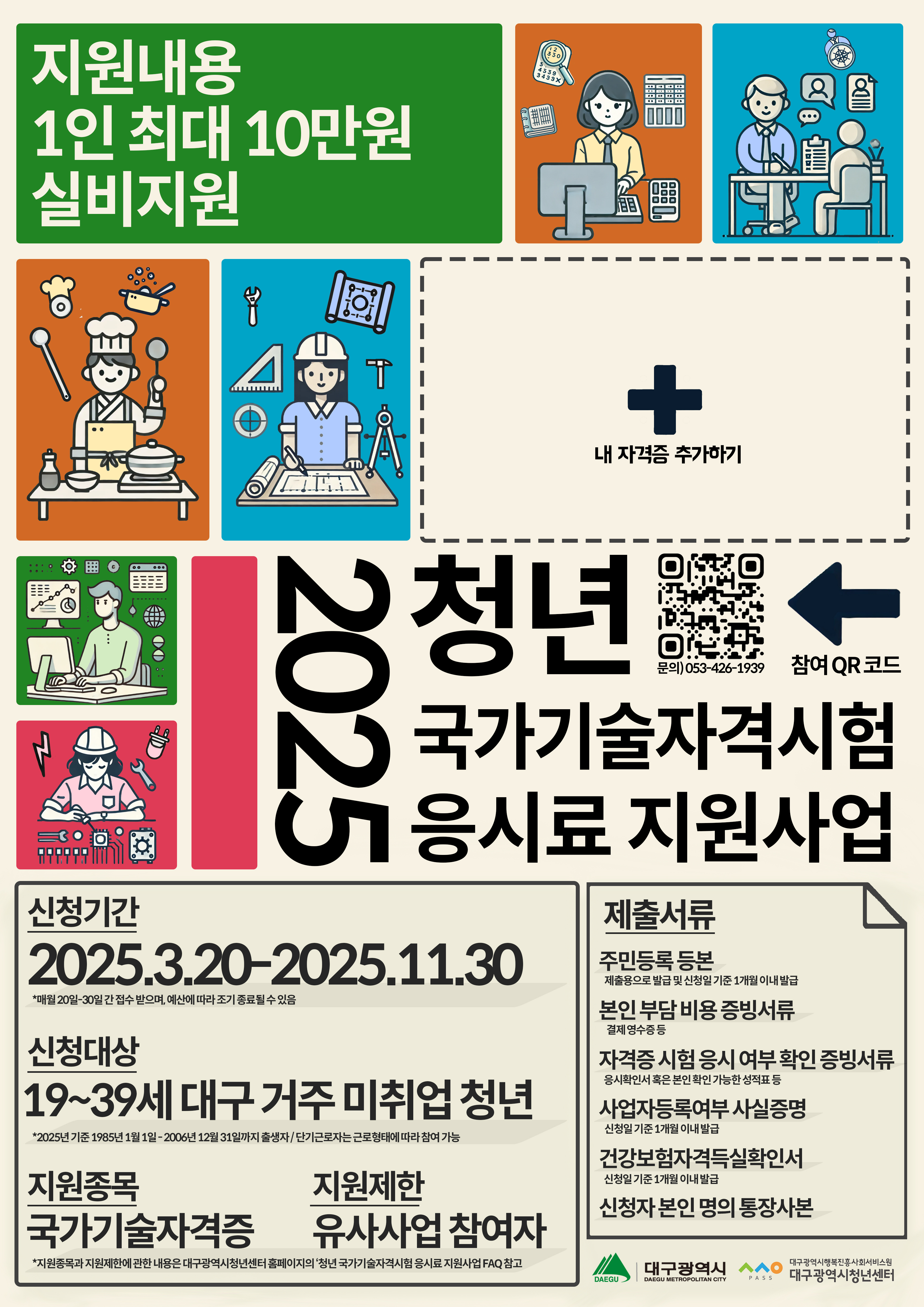 2025 청년 국가기술자격시험 응시료 지원사업 참여자 모집작성자 : 대구청년센터 작성일 : 25-03-18 대구광역시청년센터