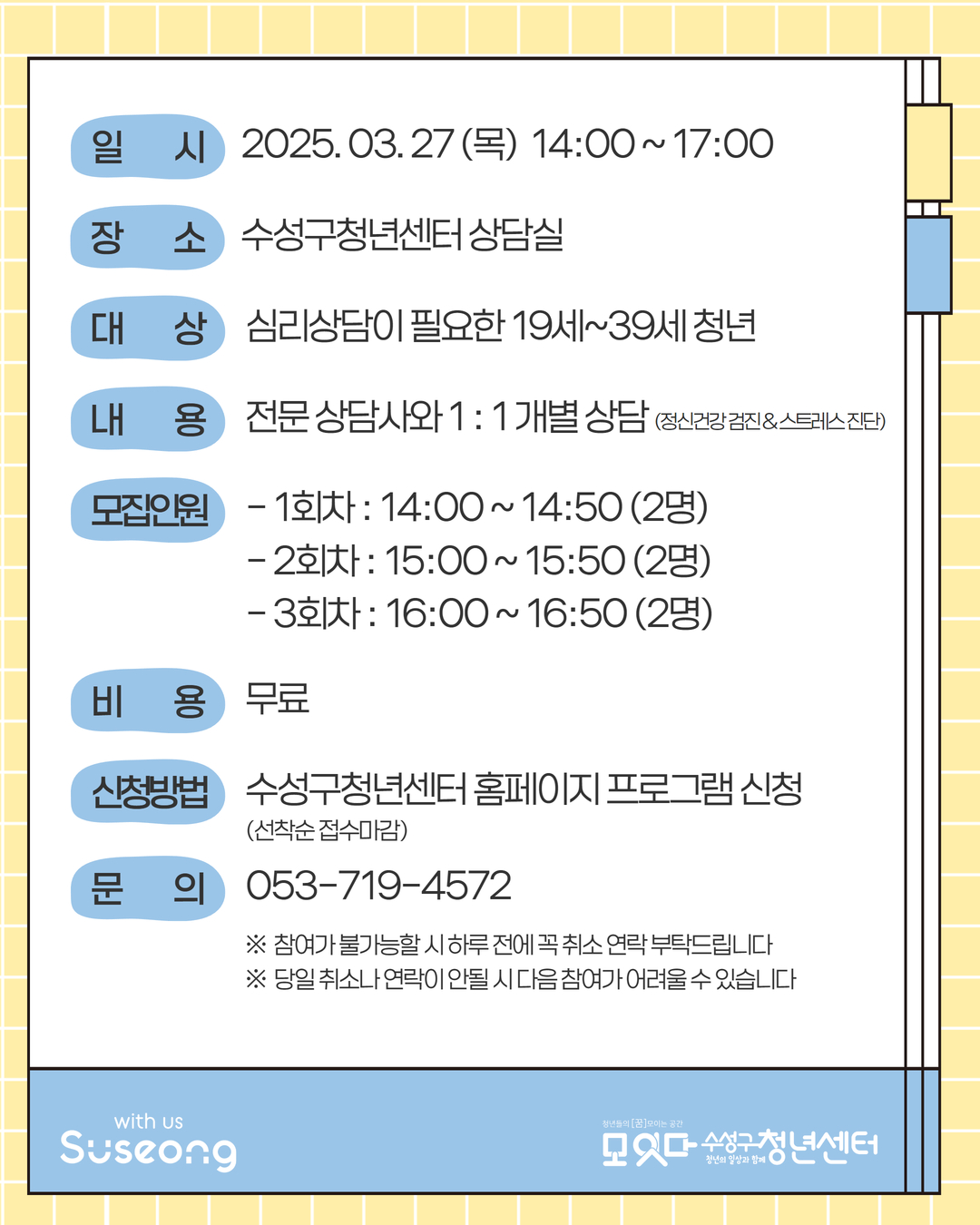 3월 청년마음상담소 with 수성구정신건강복지센터작성자 : 수성구청년센터 작성일 : 25-03-18