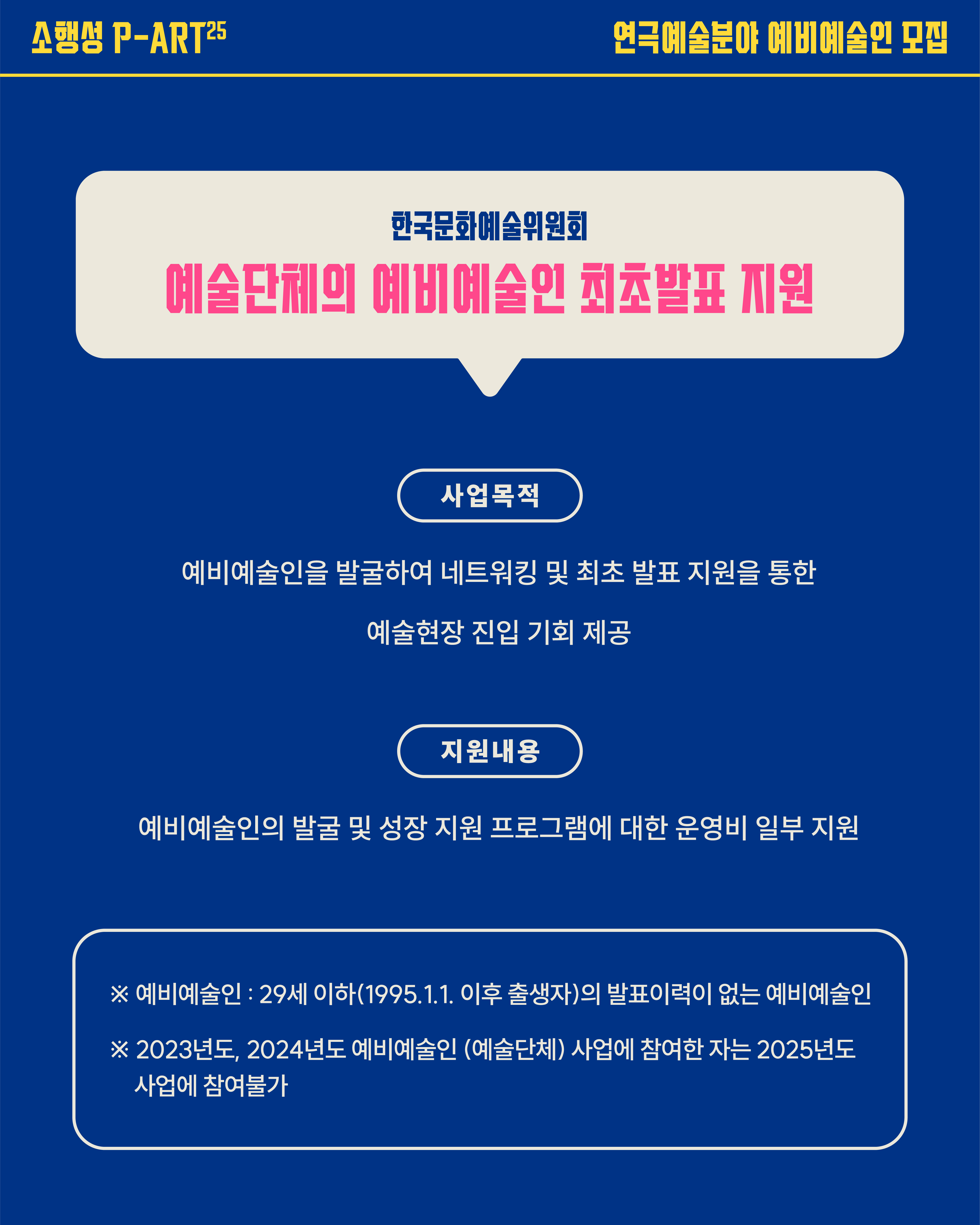 전국의 만 29세 이하(1995.1.1. 이후 출생자)의 발표 이력이 없는 연극예술분야 예비예술인