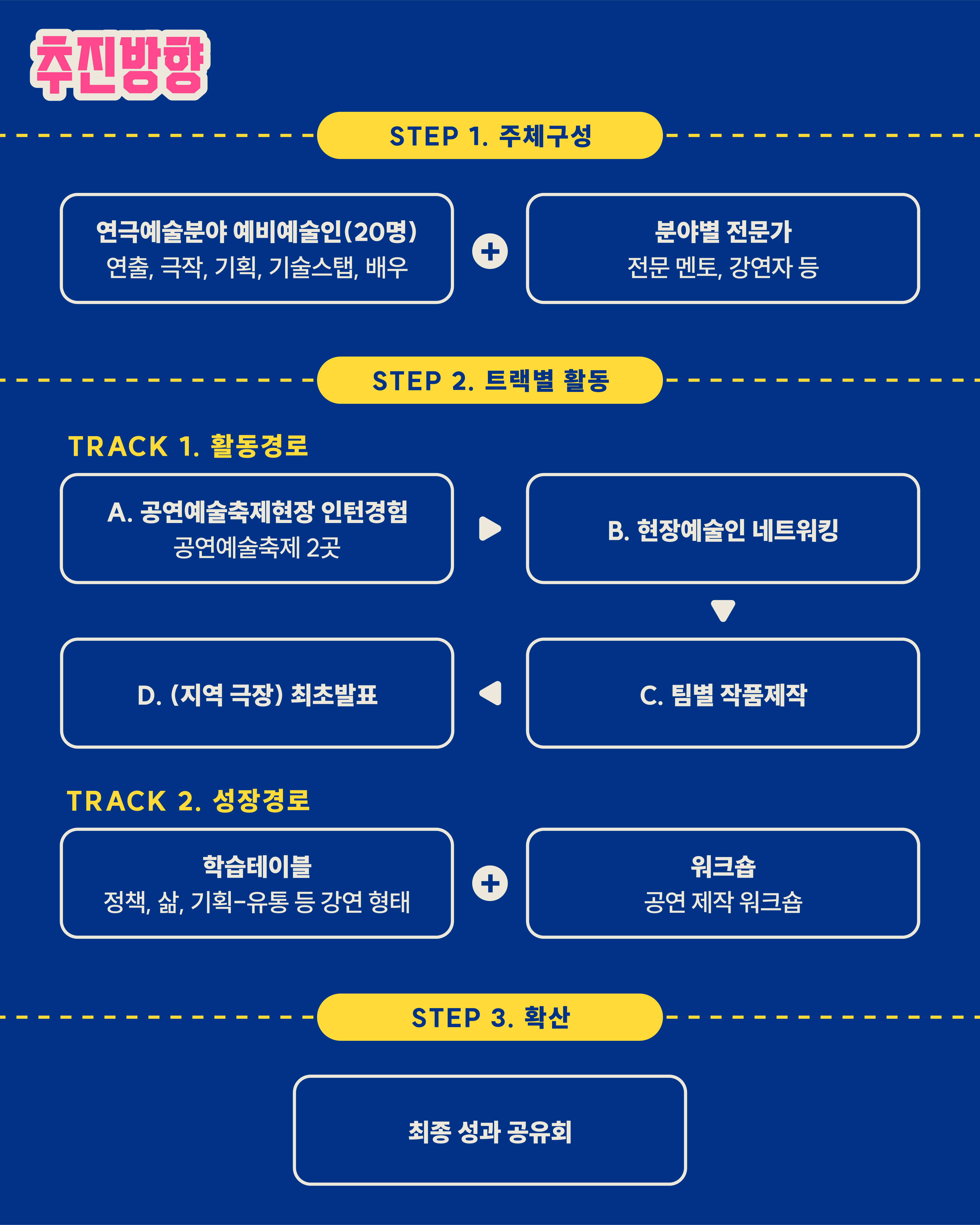 공연예술축제현장 인턴경험, 작품 창작(팀별 작품 창·제작) 및 투어공연(최초발표 경험), 현장워크숍(현장예술인 강연 및 교류) 등