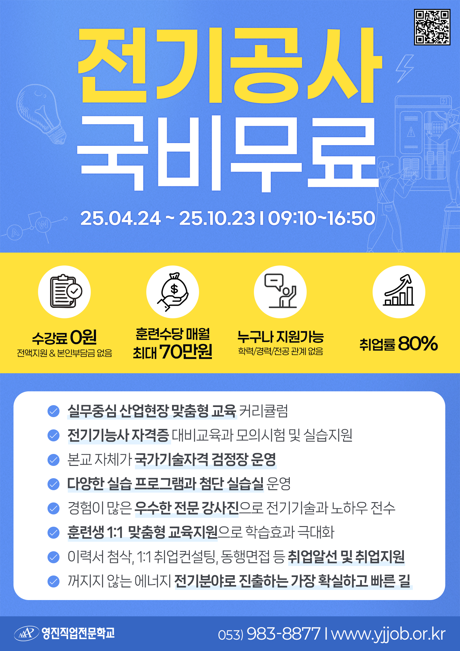 취업률 80% 이상 으로 비전공자라도 전기공사 및 전기관리자로 취업할 수 있으니 지금 바로 지원해보세요!