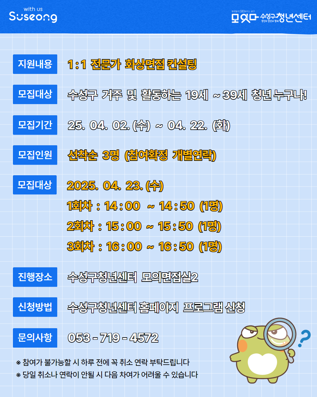 채용 전문 면접관 1:1 면접 컨설팅 (with 대구고용복지플러스센터)작성자 : 수성구청년센터 작성일 : 25-04-07