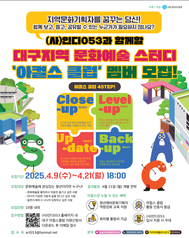 (사)인디053과 함께할 '아트컬처스터디 클럽' 멤버를 모집하오니 문화예술에 관심 있거나 대구의 다양한 사람과 삶을 만나보고 싶은 청년들의 많은 참여를 바랍니다.