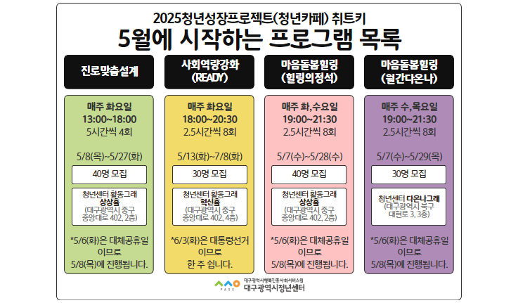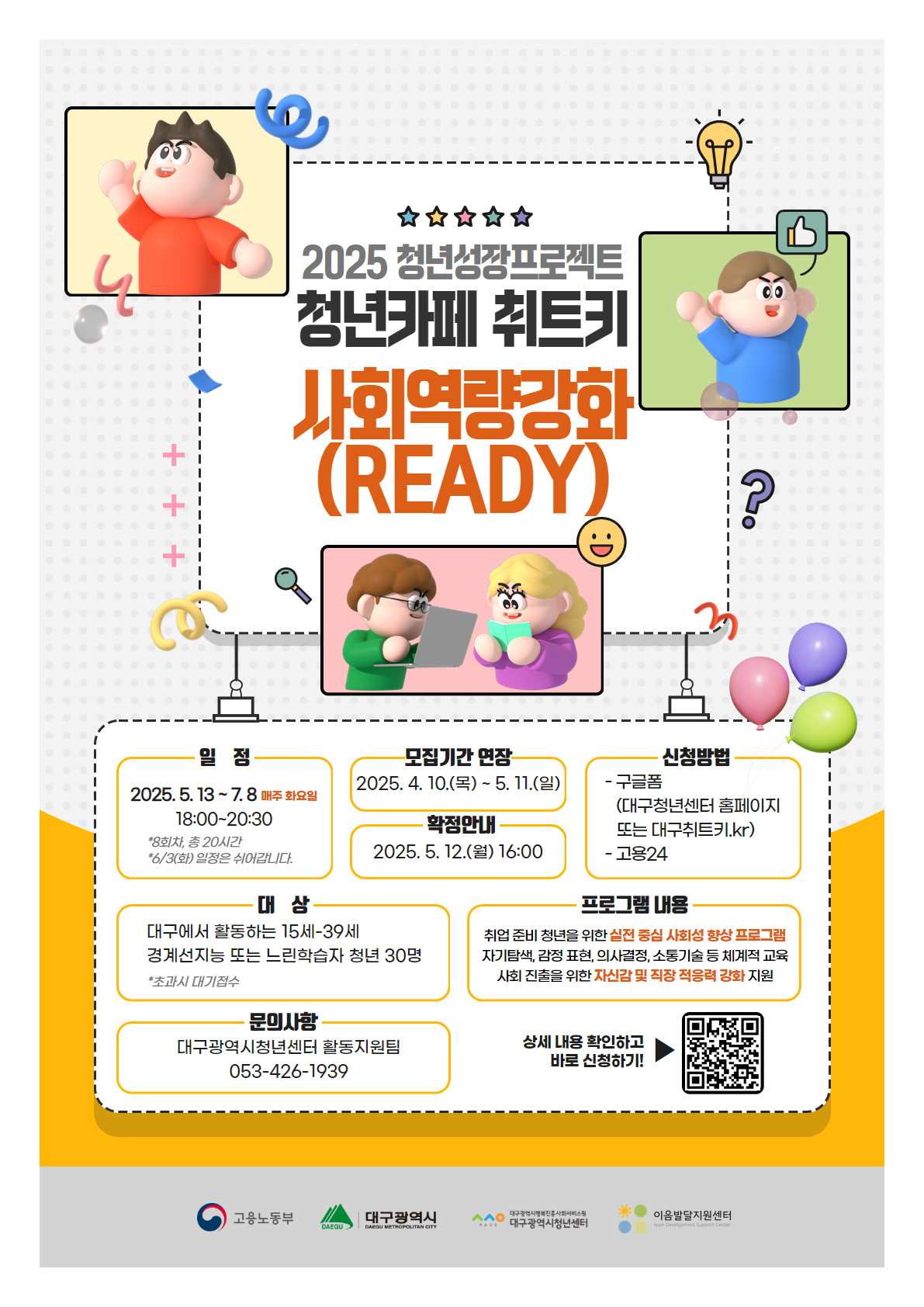 2025 청년성장프로젝트 청년카페 '취트키' 사회역량강화(READY) 참여자 모집(기간 연장)작성자 : 대구청년센터 작성일 : 25-04-10 대구광역시청년센터