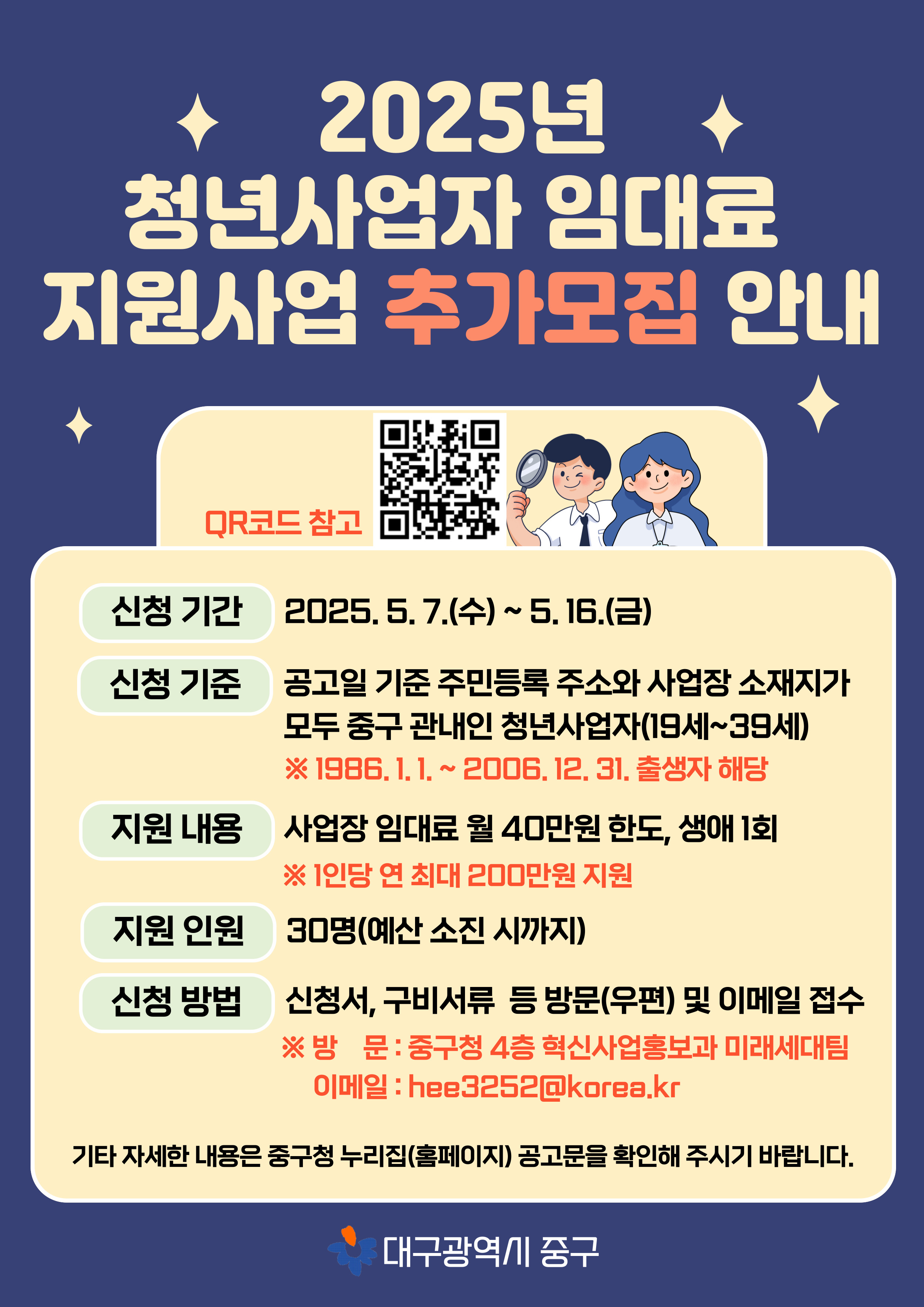 - 지원대상 : 공고일(2025.05.07) 현재 주민등록 주소와 사업장 소재지가 모두 중구 관내인 청년사업자