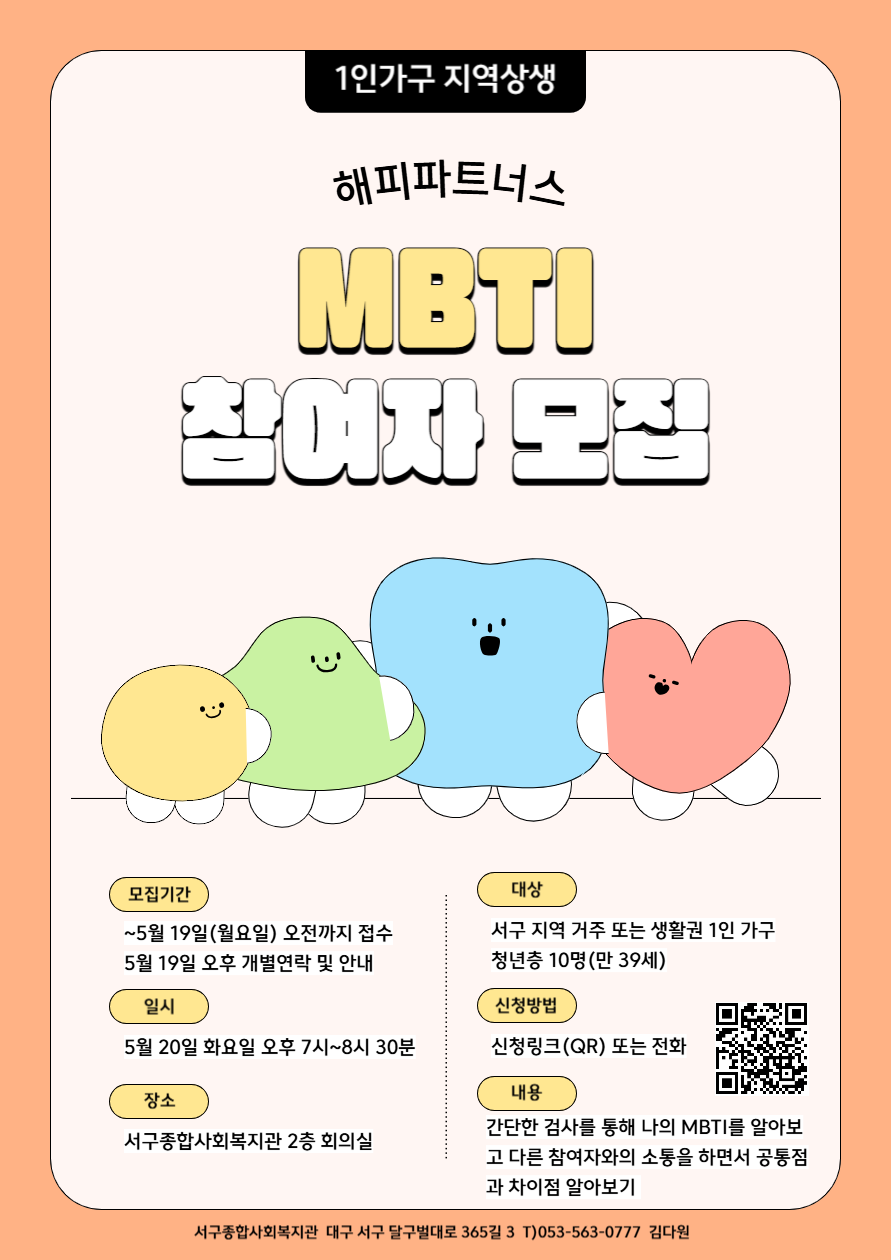 해피파트너스 5월 MBTI 프로그램 참여자 모집작성자 : 김다원 작성일 : 25-05-14