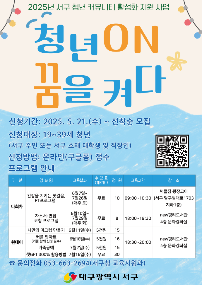 청년ON:꿈을 켜다 1기 프로그램 참여자 모집(서구 거주 주민, 서구 소재지 대학생 및 직장인 참여 가능)작성자 : 김규연 작성일 : 25-05-20
