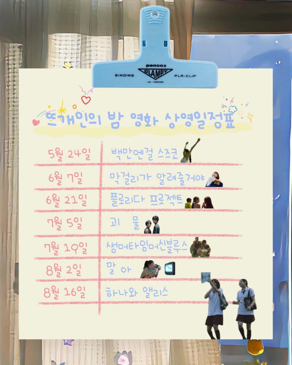 - 일시 : 5/10(토) ~ 8/16(토), 격주 토요일 19시 30분 (전체 일정은 이미지를 참고해 주세요. 종료 시간은 영화 러닝타임에 따라 상이합니다.)