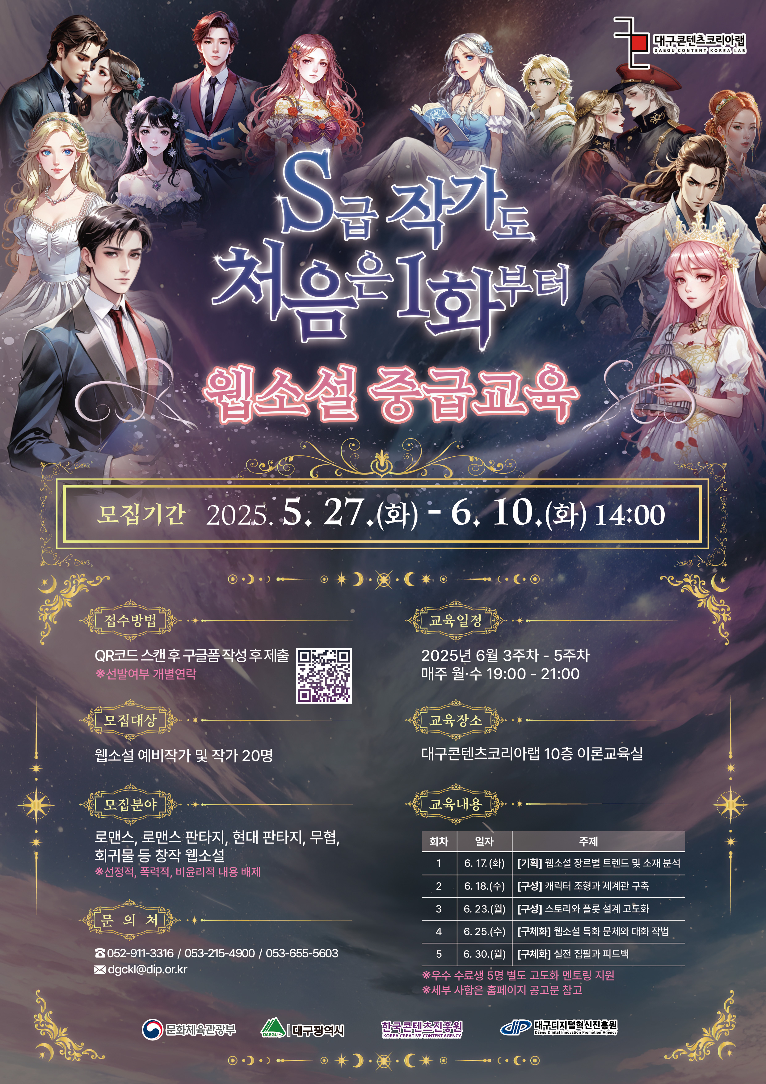 2025년 대구콘텐츠코리아랩 크리에이터 사업화 프로그램 웹소설 중급교육 참가자 모집(~6.10)작성자 : 권봉재 작성일 : 25-05-28