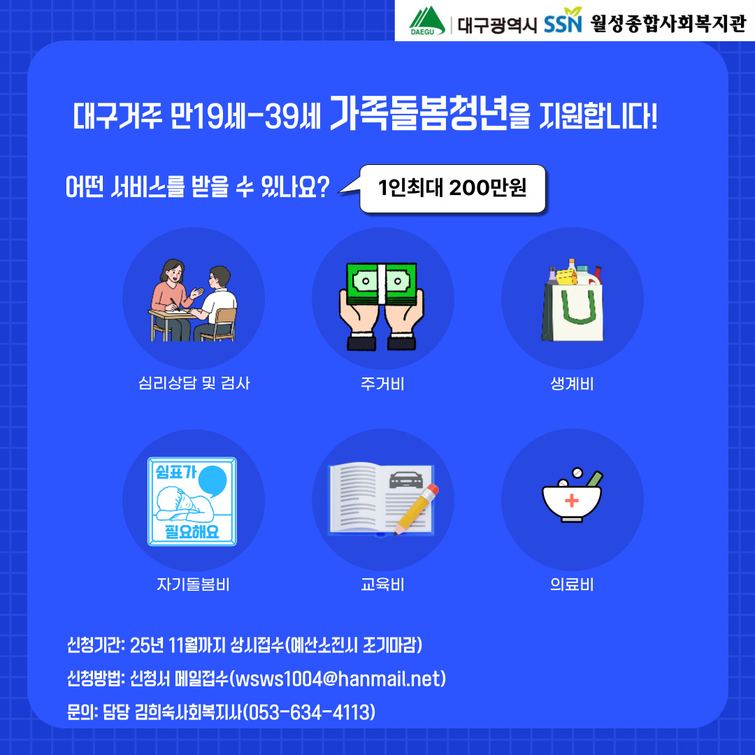 월성종합사회복지관 청년베이스캠프에서 대구 거주 만19세-39세의 가족돌봄청년을 지원합니다.