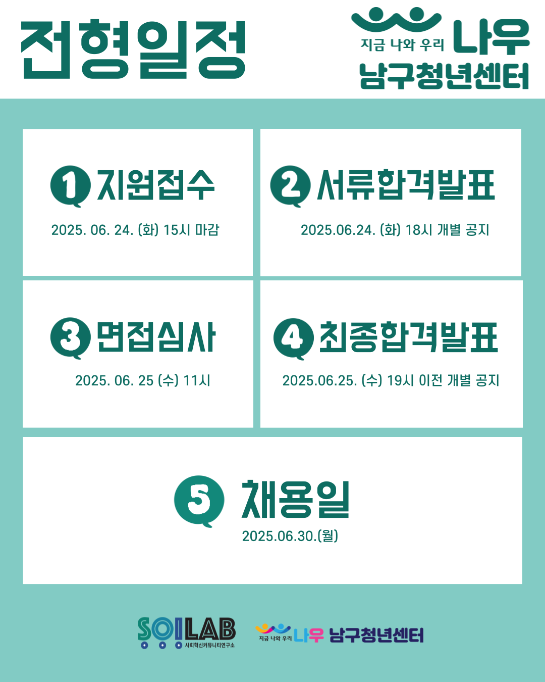3) 최종합격자 발표 : 2025년 6월 25일(수) 19:00 이전 개별통보 및 남구청년센터 홈페이지 게시
