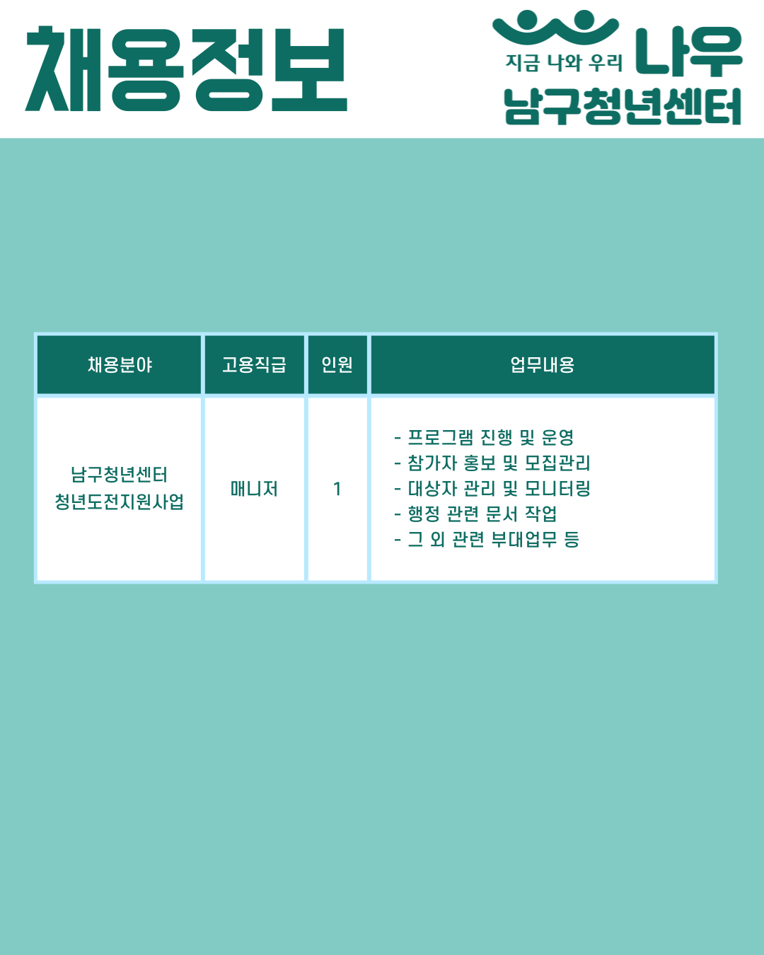 남구청년센터 청년도전지원사업 매니저 채용공고작성자 : 이민지 작성일 : 25-06-17