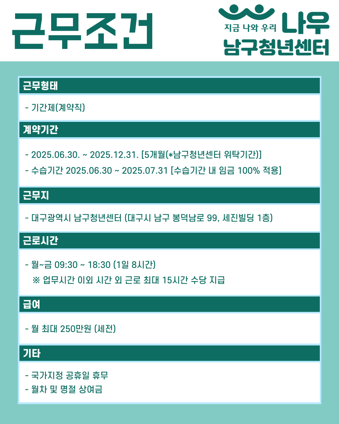 마. 근무지역 : 대구광역시 남구청년센터(대구광역시 남구 봉덕남로 99, 세진빌딩 1층 남구청년센터)