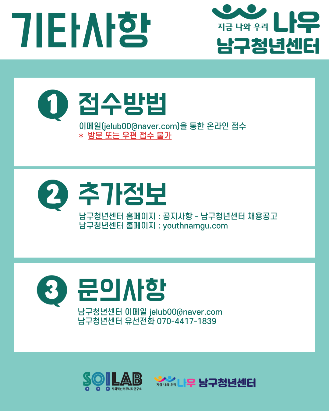 - 메일 제목에 [남구청년센터 채용지원] 표기 요망