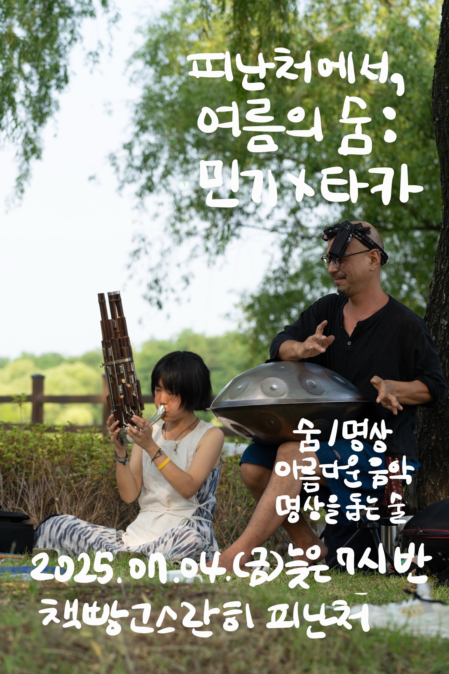안습습지에서 열린 ‘N월의 피크닉’에서 민기, 타카 두 사람의 음악과 새와 바람 소리를 만났어요. 그 순간 도시의 시간과 공간에 어떤 균열이 생기는 듯한 기분이 들었습니다. 상주에서 만드는 명상주 ’Bewater Brew로 평화를 더했었습니다. 여운이 오래 남았어요. 그리고 다시 고스란히 피난처에서 그 아름다운 순간을 만나고 싶어 작은 공연을 기획했습니다.