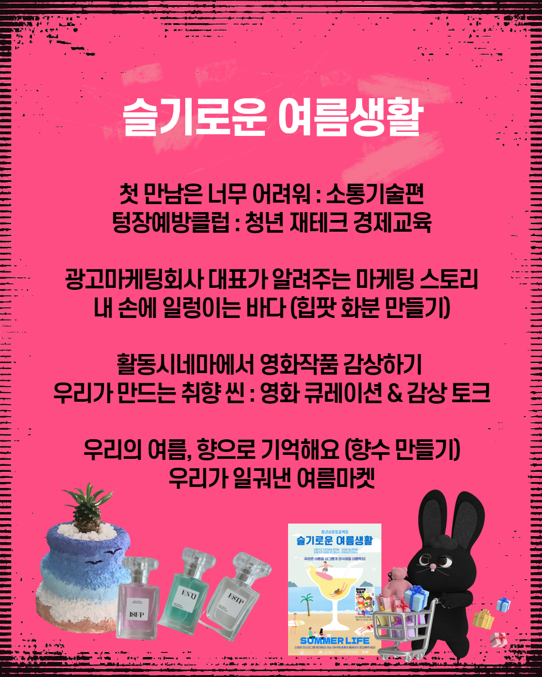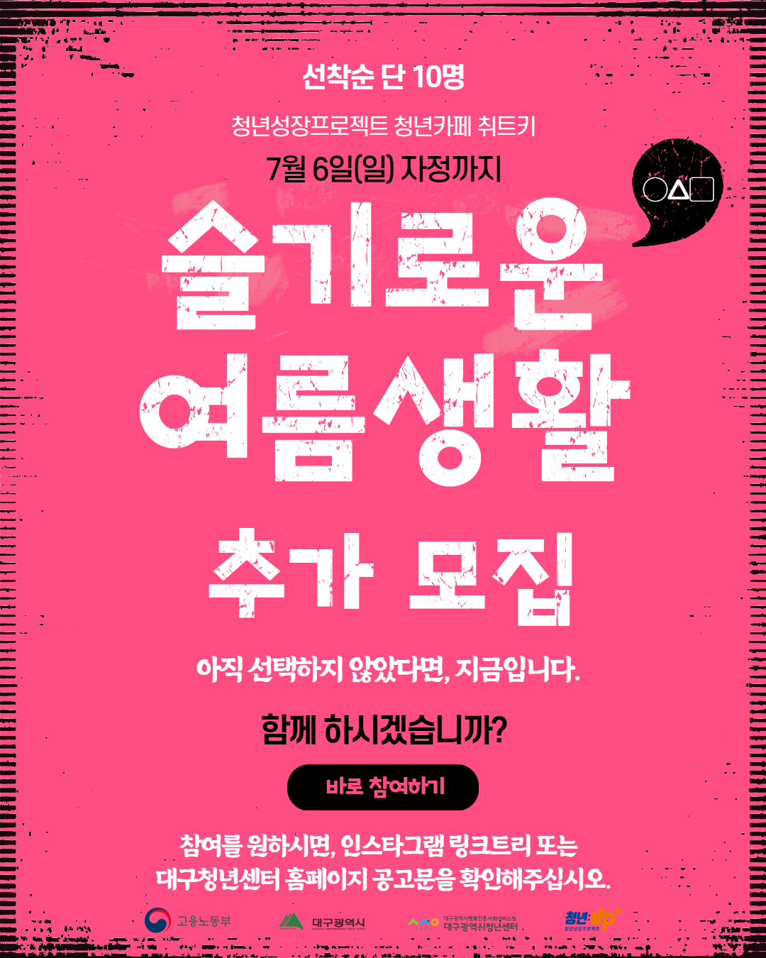 2025 청년성장프로젝트 청년카페 '취트키' 7월 프로그램(슬기로운여름생활) 참여자 추가 모집작성자 : 대구청년센터 작성일 : 25-07-01 대구광역시청년센터