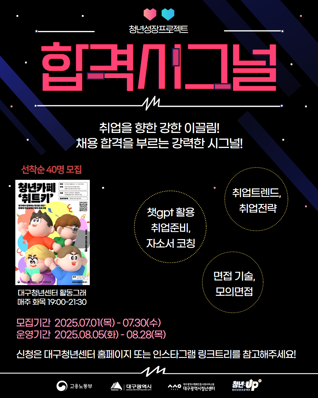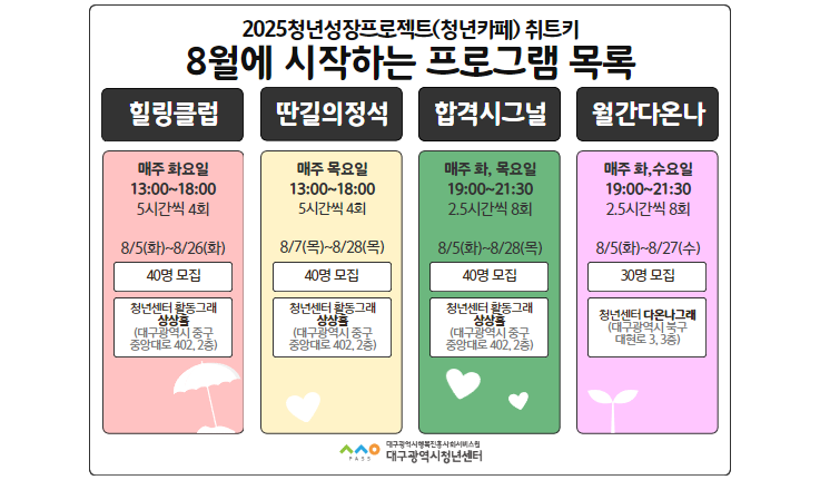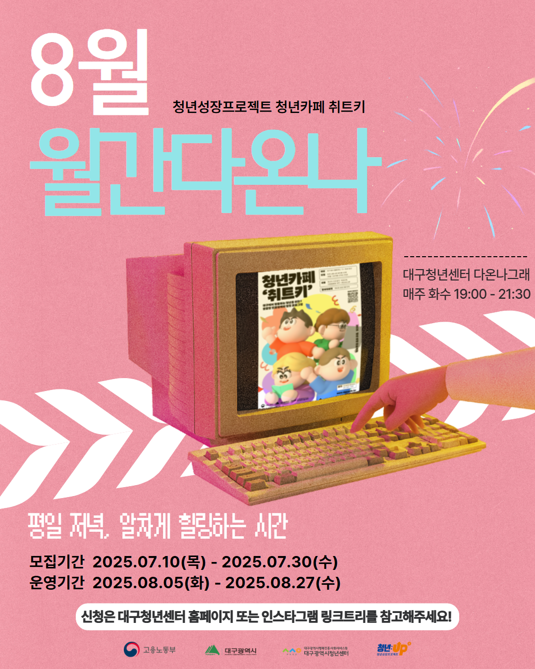 2025 청년성장프로젝트 청년카페 '취트키' 8월 프로그램 참여자 모집작성자 : 대구청년센터 작성일 : 25-07-09 대구광역시청년센터