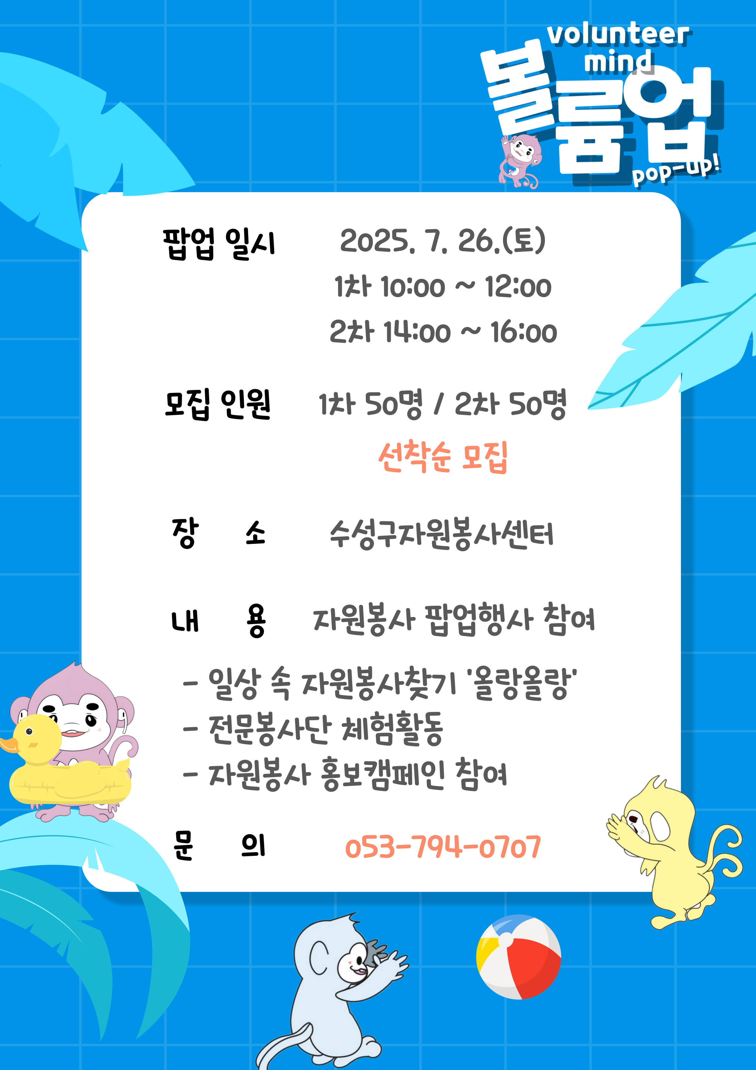 [수성구자원봉사센터] 볼륨업!(자원봉사 팝업 행사) (오후 14:00~16:00 봉사시간 2시간 인정)작성자 : 박소현 작성일 : 25-07-14