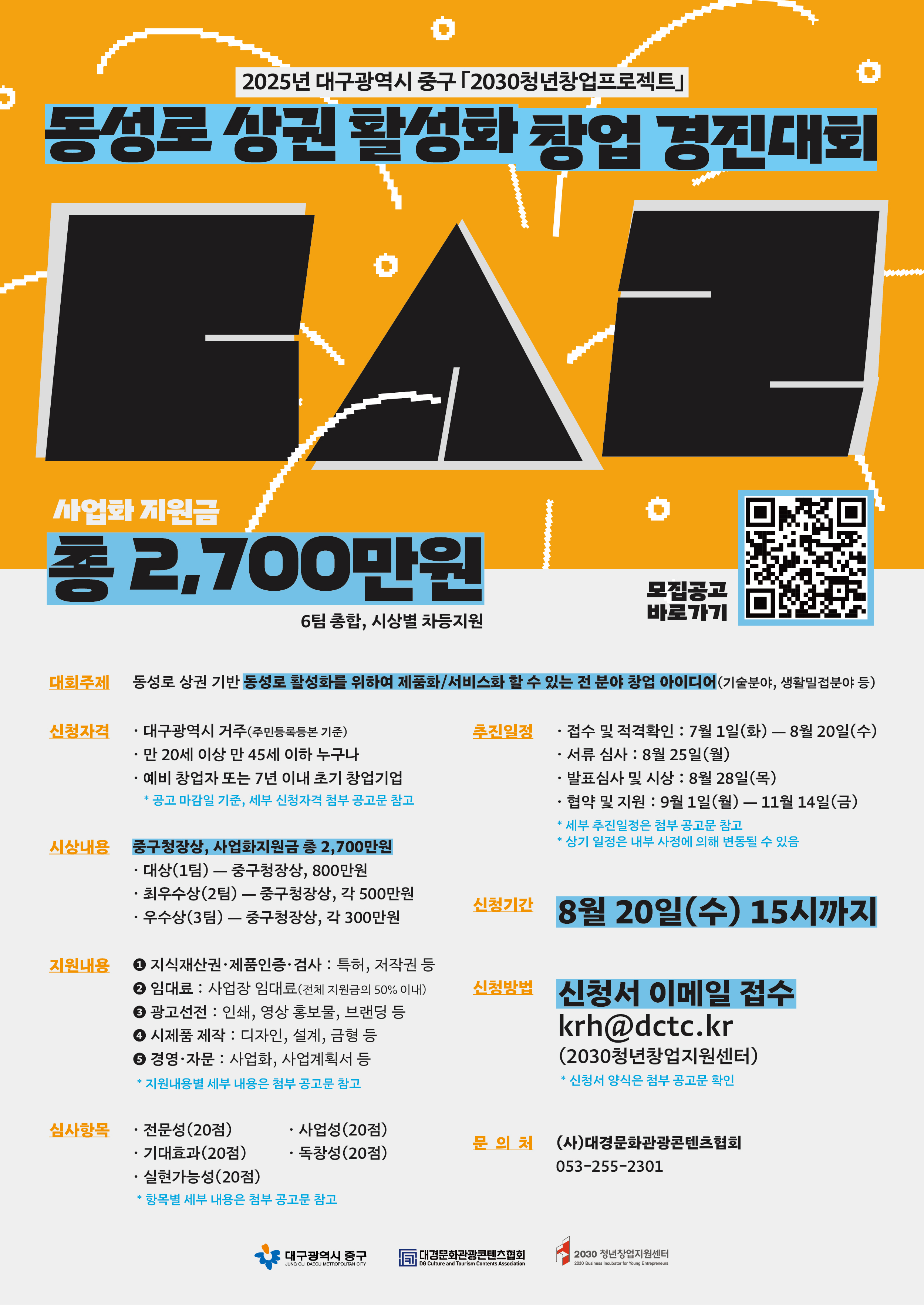 ⭐2025년 대구광역시 중구「2030청년창업프로젝트」동성로 상권 활성화 창업 경진대회 참가자 모집 공고⭐작성자 : 한인섭 작성일 : 25-07-23