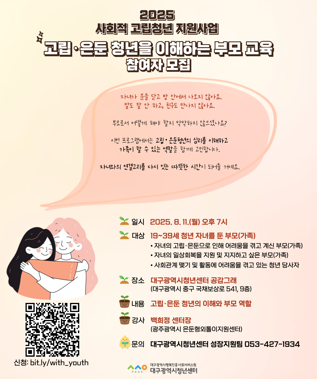 2025 사회적 고립청년 지원사업 <고립·은둔 청년을 이해하는 부모교육> 참여자 모집작성자 : 대구청년센터 작성일 : 25-07-29