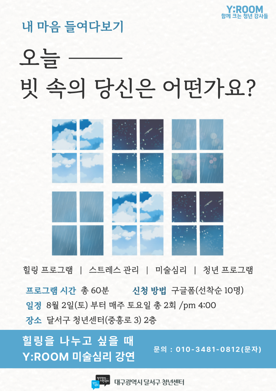 함께크는 청년강사 Y:ROOM 미술심리 힐링강좌 수강생 모집작성자 : 유화정 작성일 : 25-07-29