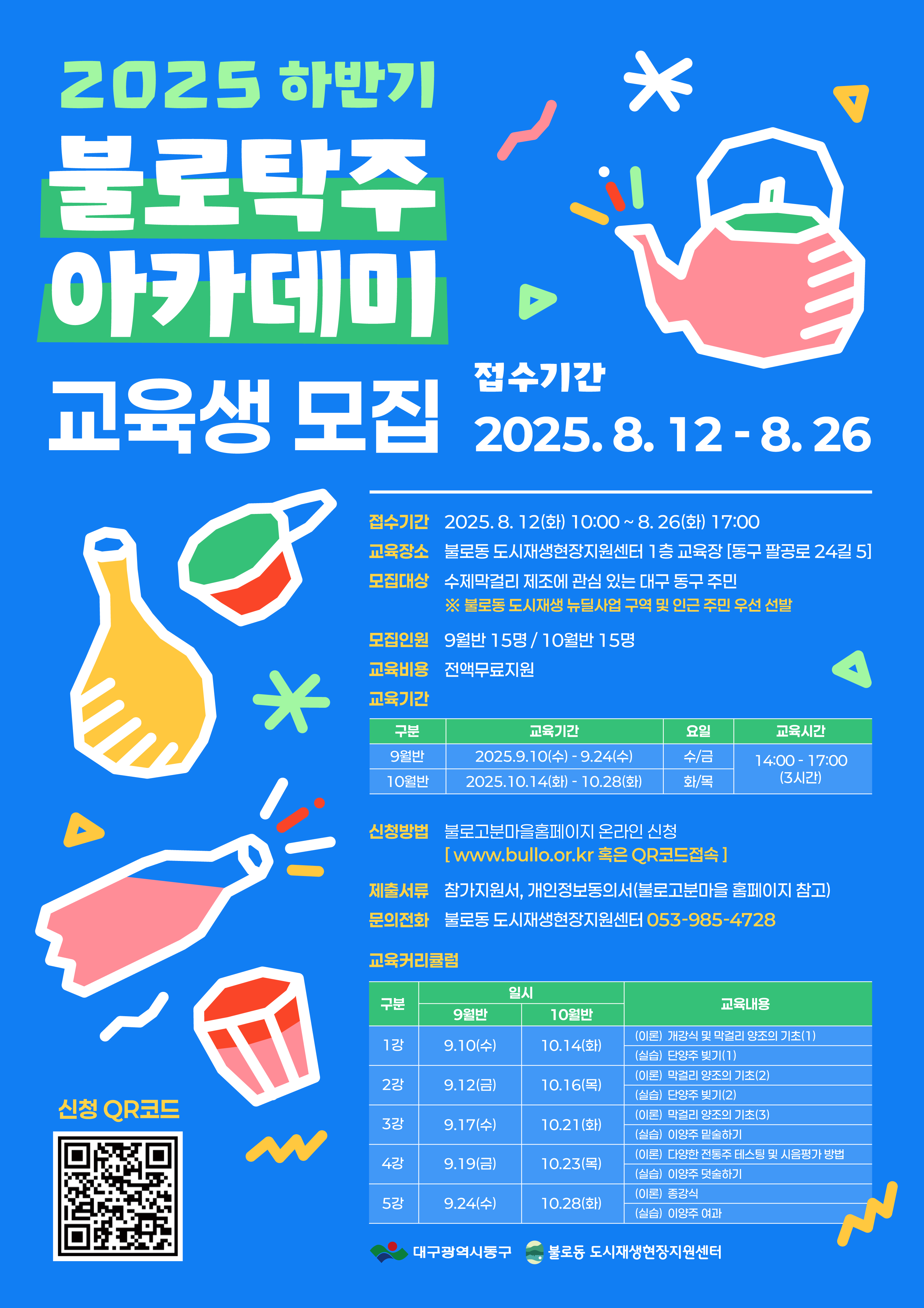 불로동 도시재생현장지원센터는 불로동 도시재생사업 구역 내 전통 막걸리 문화를 활성화하고자 「2025 불로탁주아카데미」을 시행하오니 막걸리 제조에 관심 있는 대구 동구 주민 여러분들의 많은 관심과 참여를 바랍니다.