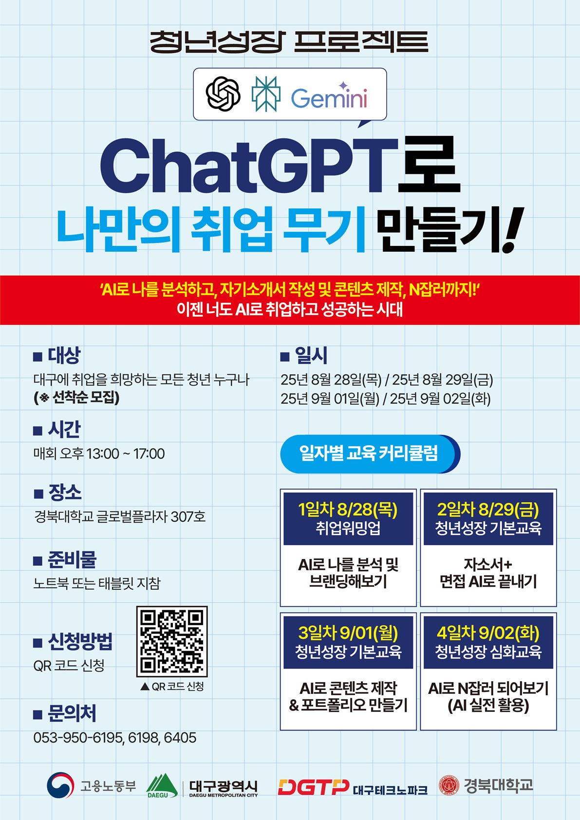 🔥 실전 중심 AI 특강! "ChatGPT로 나만의 취업무기 만들기" 프로그램을 준비 중입니다.