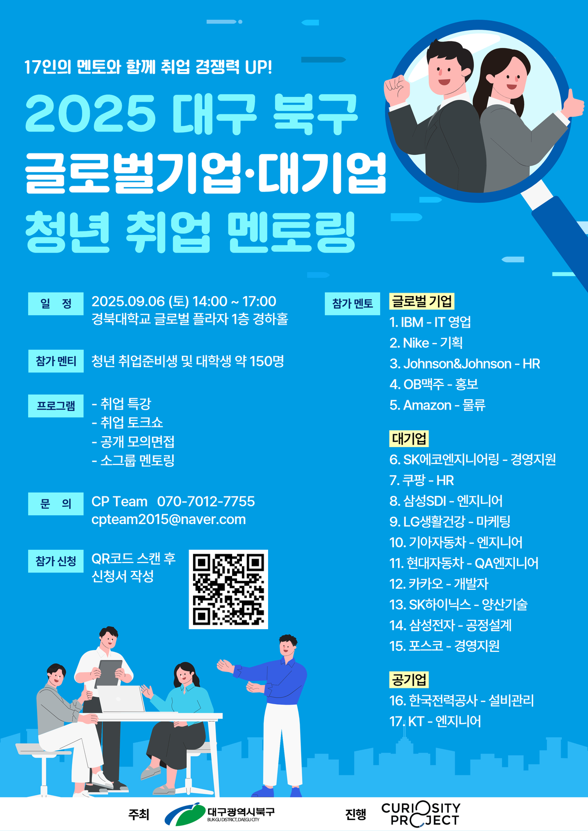 [북구] 2025 대구 북구 글로벌기업, 대기업 청년 취업 멘토링 (~9/6)작성자 : CP Team 작성일 : 25-08-11