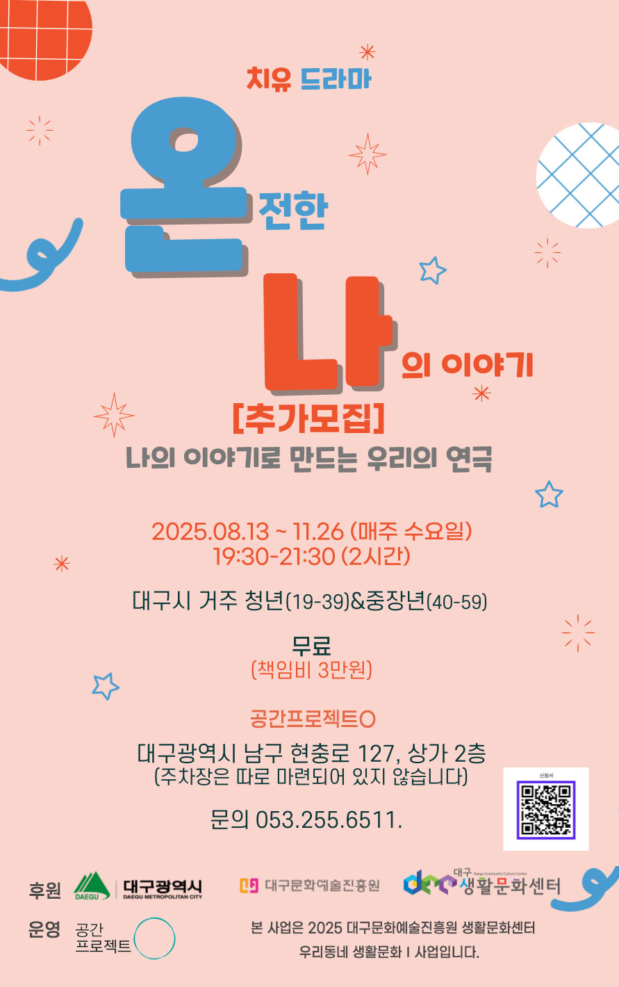 [2025 생활문화육성지원사업] 나만의 연극 만들기 - 치유드라마 <온나:온전한 나의 이야기> 추가모집!작성자 : 최일선 작성일 : 25-08-13