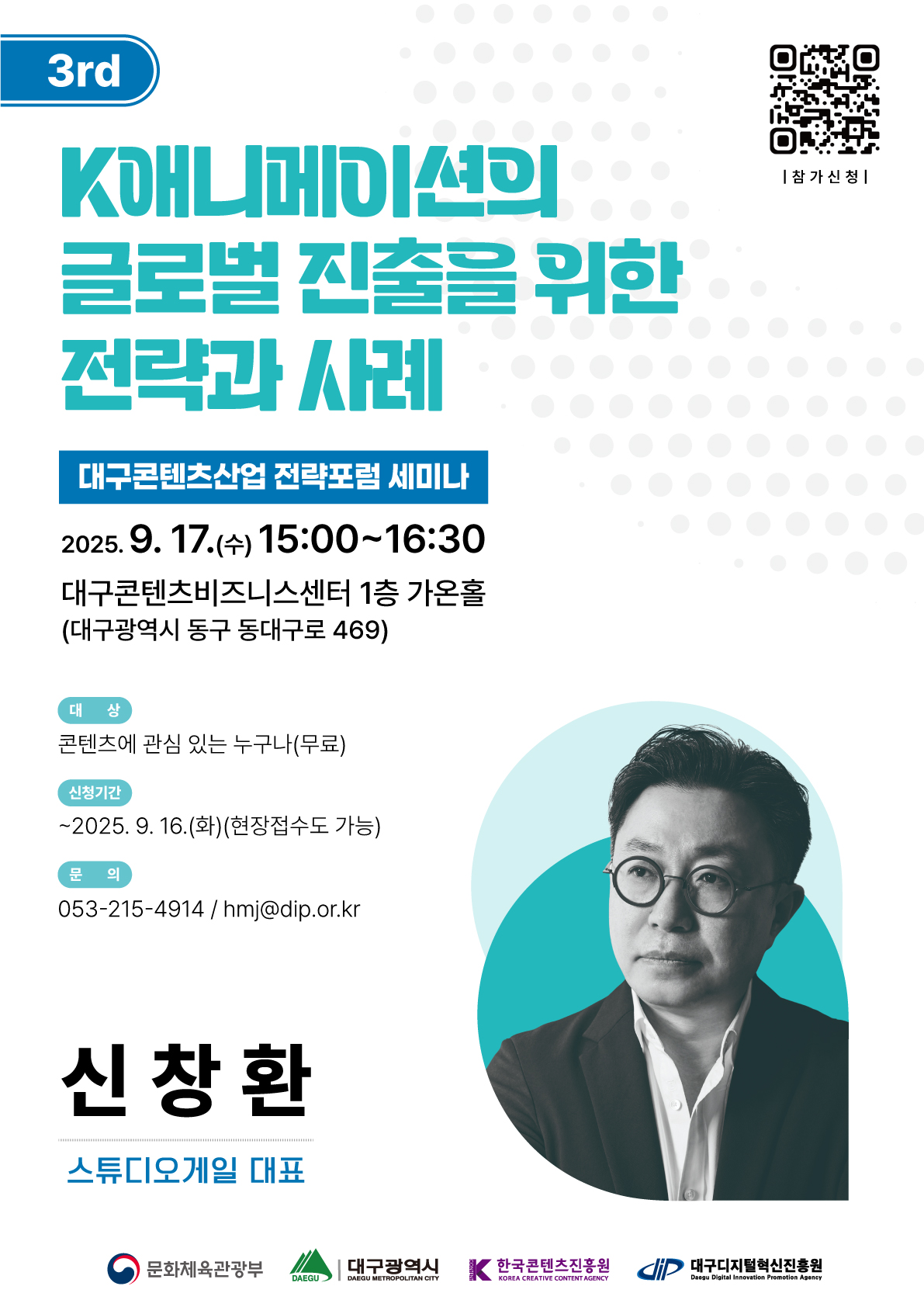 [무료 세미나] 2025년 대구콘텐츠산업 전략포럼 세미나(3회차/스튜디오게일 신창환 대표)작성자 : 하민지 작성일 : 25-08-22