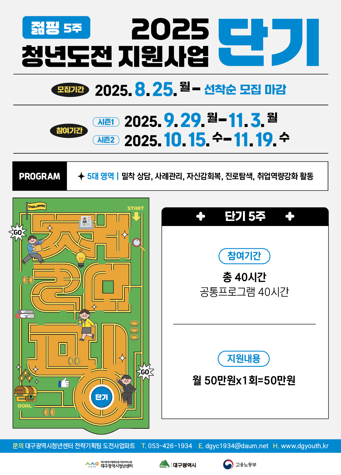 2025 청년도전지원사업 '젊핑' 단기(5주) 시즌1, 2 프로그램 참여자 모집작성자 : 대구청년센터 작성일 : 25-08-25 대구광역시청년센터
