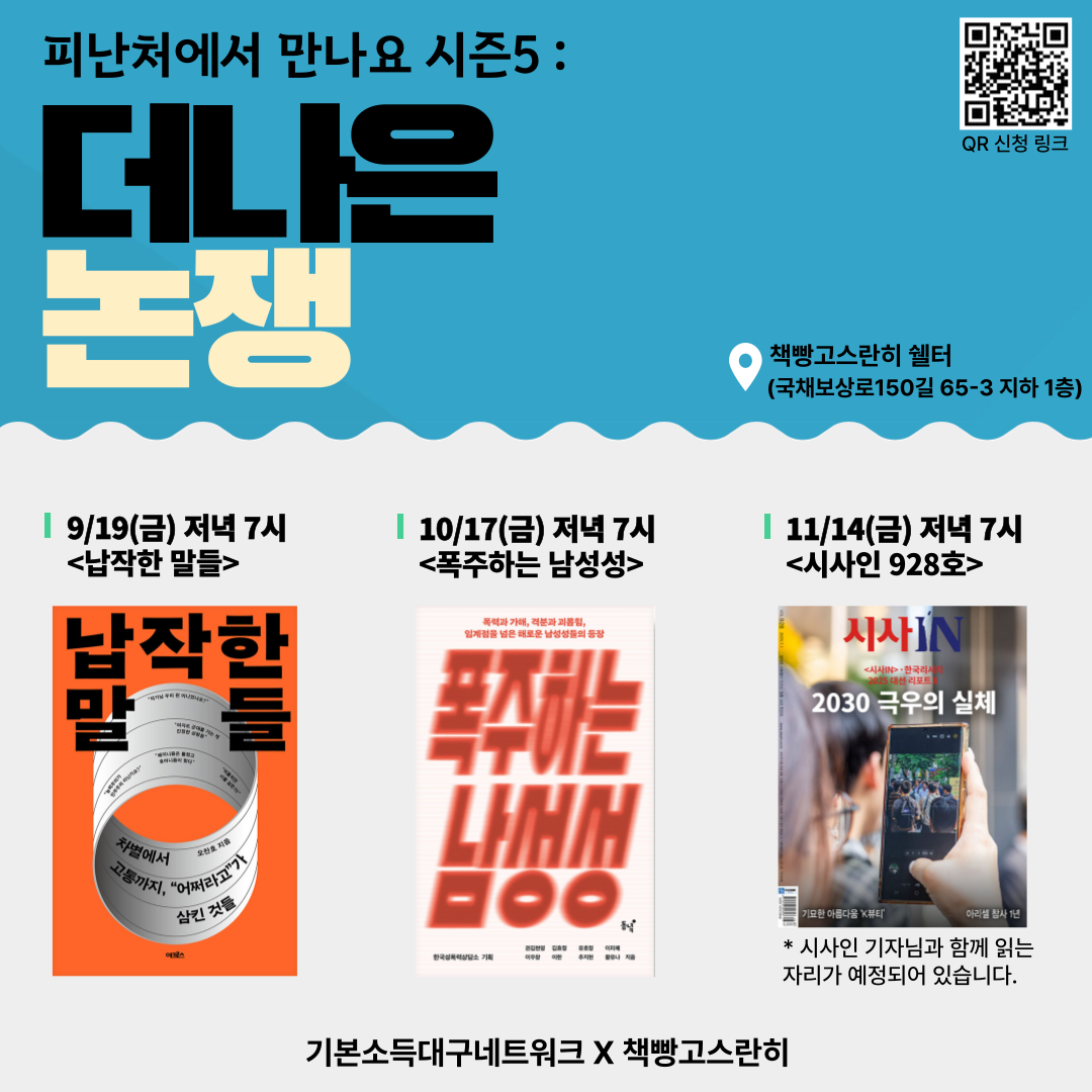 기본소득대구네트워크x책빵고스란히가 함께하는 ‘피난처에서 만나요’ 독서모임 구성원을 모집합니다. 2023년부터 이어져 온 독서모임 ‘피난처에서 만나요’ 이번 시즌5에서는 ‘더 나은 논쟁’이라는 주제로 2025년 9월~11월 3개월 동안 3권의 책을 함께 읽습니다.