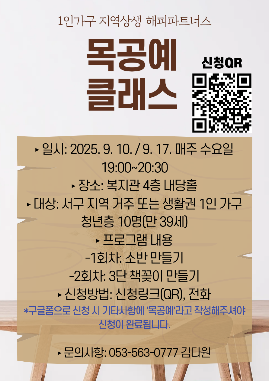 [서구종합사회복지관] 해피파트너스 목공예 프로그램 참여자 모집작성자 : 김다원 작성일 : 25-08-29