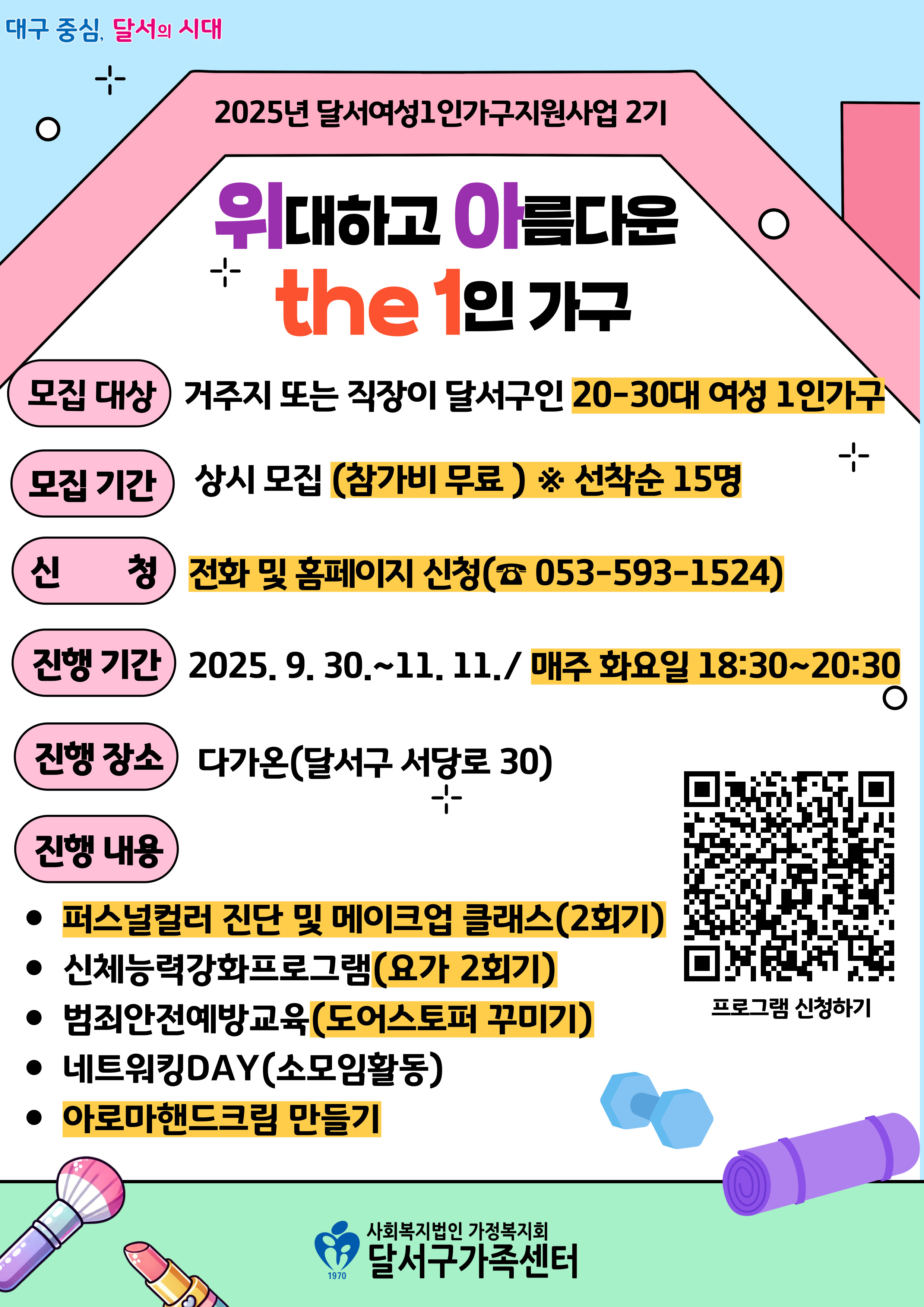 달서 여성1인가구지원사업 '위·아·the 1' 2기 참여자 모집작성자 : 황선미 작성일 : 25-09-15