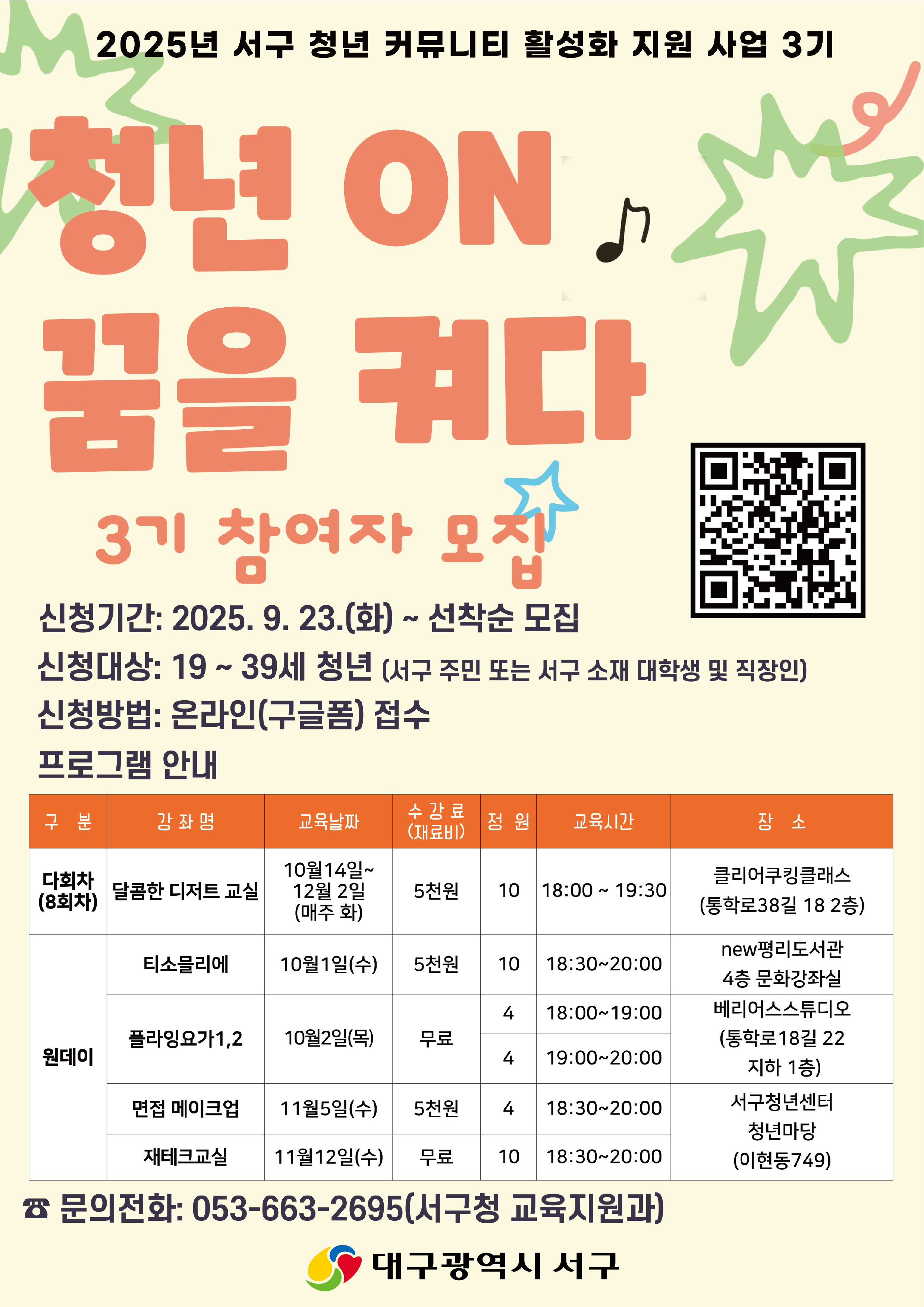 청년ON:꿈을 켜다 3기 프로그램 참여자 모집(서구 거주 주민, 서구 소재지 대학생 및 직장인 참여 가능)작성자 : 김규연 작성일 : 25-09-18