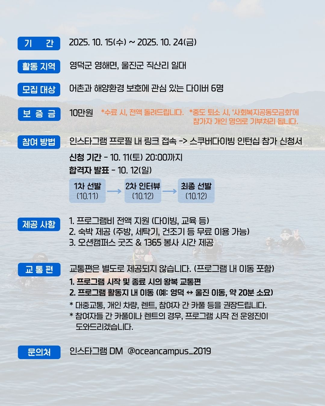스쿠버 다이빙으로 바다숲 복원 현장에 직접 참여하는 10일간의 특별한 인턴십 프로그램, 오캠십일에 여러분을 초대합니다.