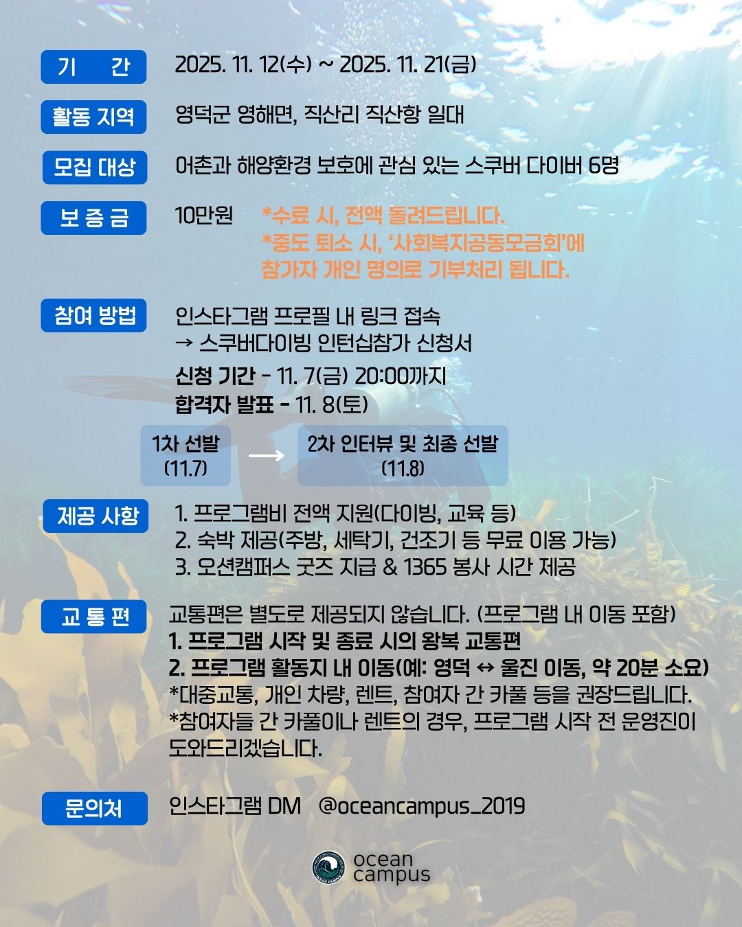 오션캠퍼스 인스타그램 프로필 링크 접속 → 스쿠버다이빙 인턴십 참가 신청서 작성
