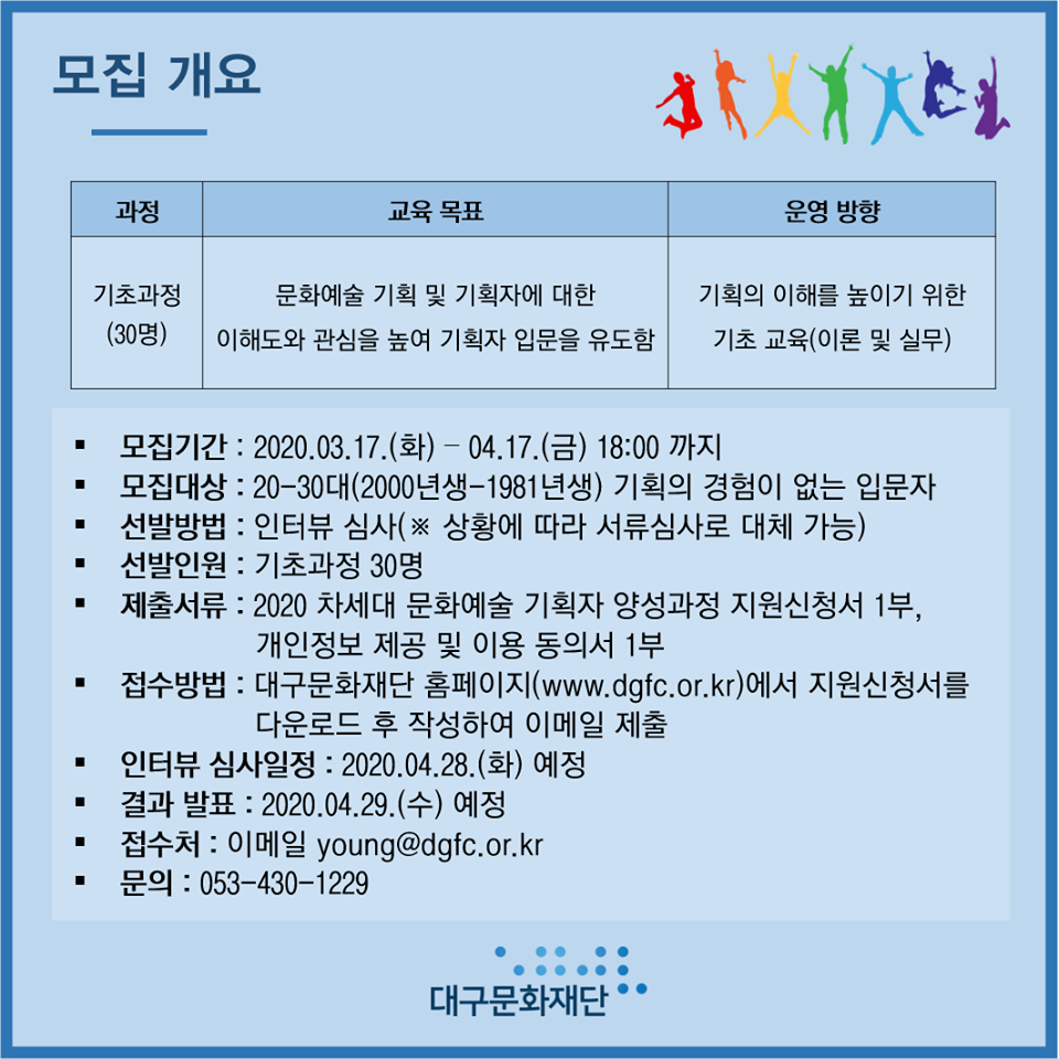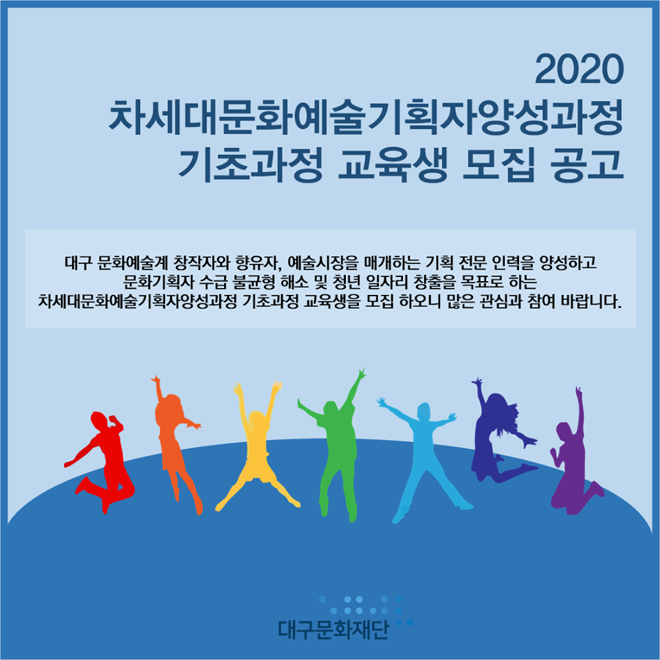 2020 차세대문화예술기획자양성과정 기초과정 교육생 모집작성자 : 김영종 작성일 : 20-03-30