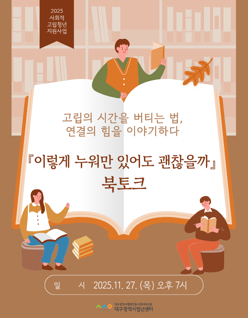 2025 사회적 고립청년 지원사업 <북토크> 참여자 모집작성자 : 대구청년센터 작성일 : 25-11-10 대구광역시청년센터
