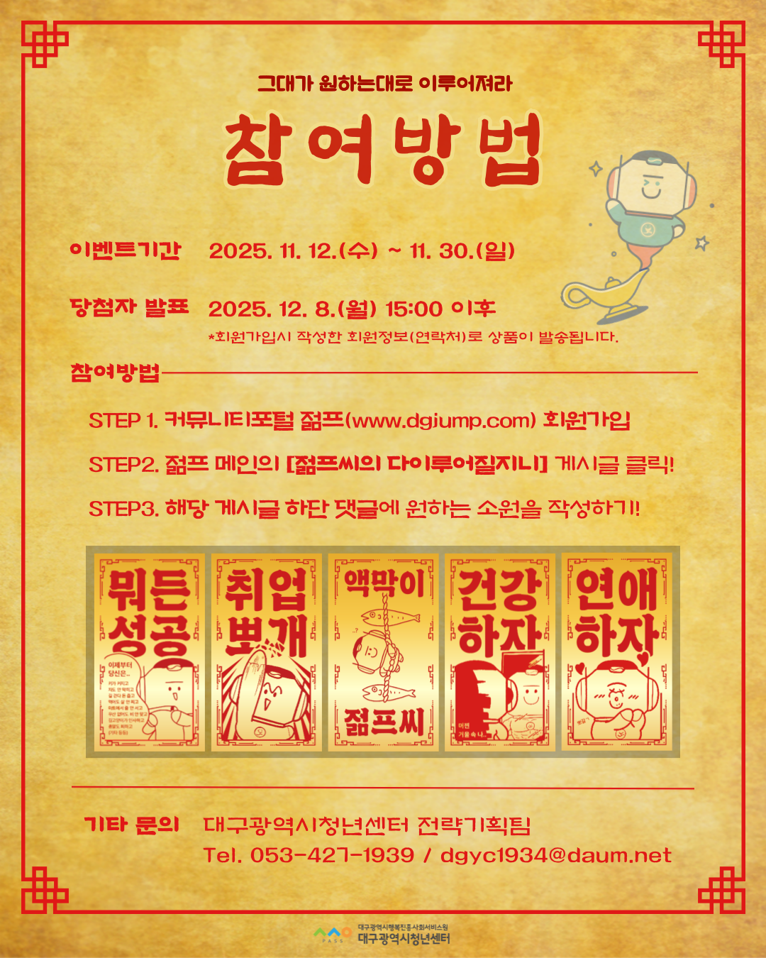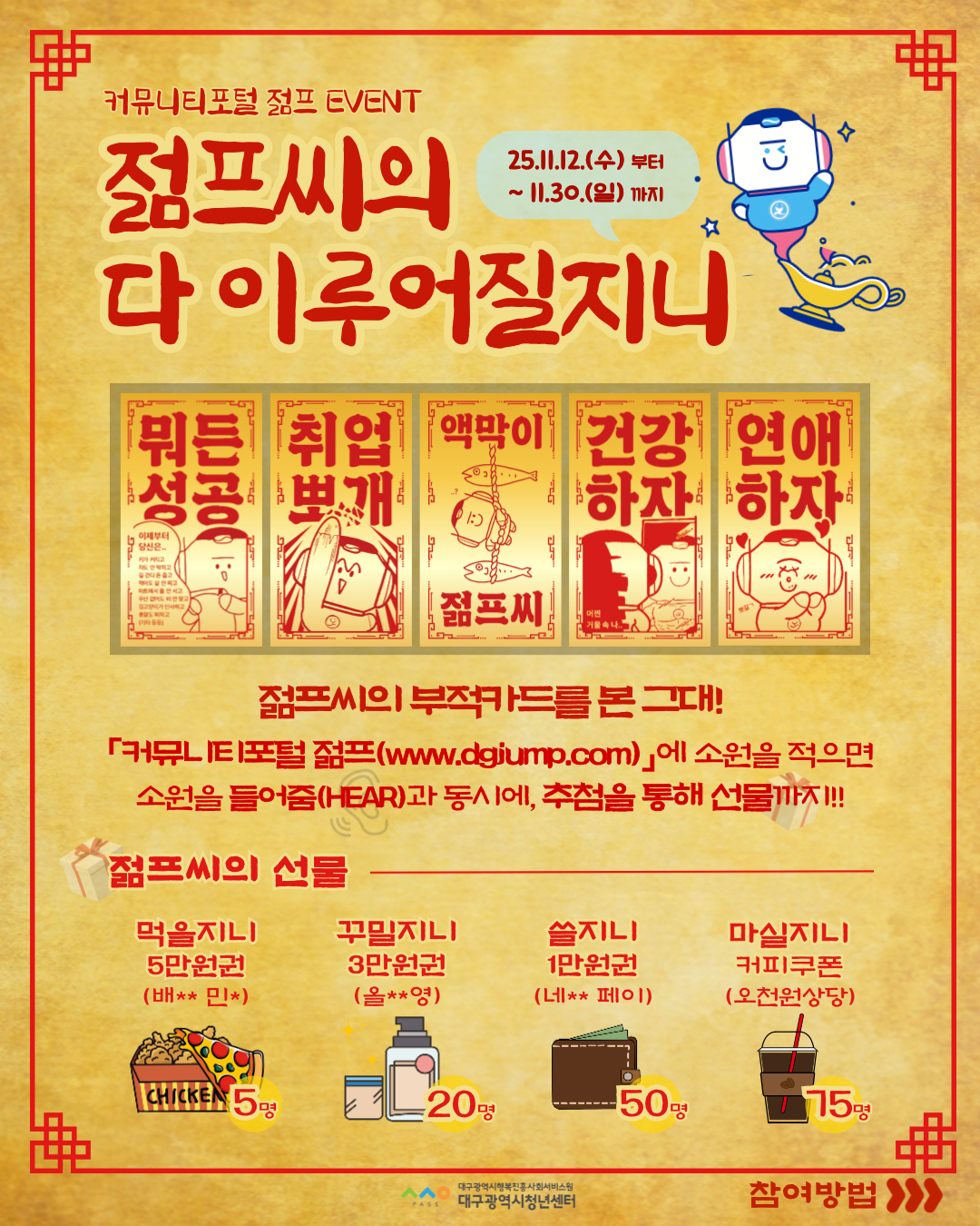소원부적이 너무 다 좋아서 하지만 1개를 고르라하면 뭐든성공으로 할게요! 젊프씨 2025년도 고생 많았고 내년에도 청년정책 잘 부탁해요!! 함께 2026 뭐든 성공하며 점프 잘하게 도와줘요 젊프씨 :)